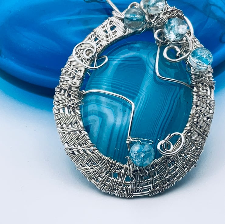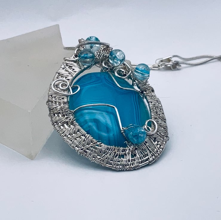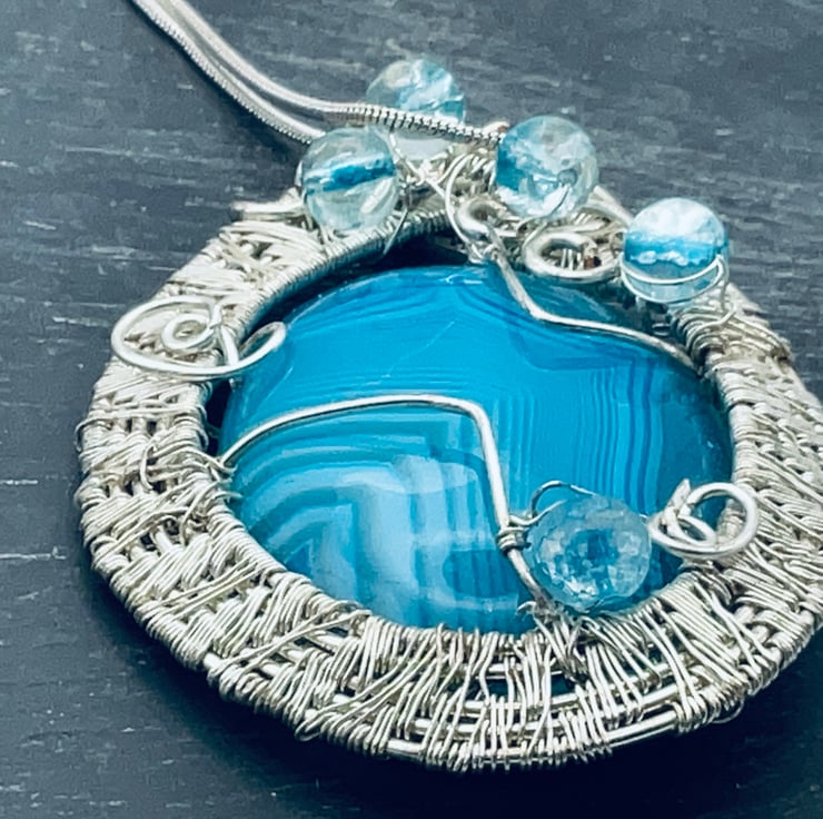 Thus pendant intends to be noticed. The stunning stone is an absolute joy to behold. It is captured in a wide complex woven silver wire band with sympathetic treatment of the geometric lines and finished with matching stippled quartz beads. It is large at 35 x 55 mmi in size. It hangs on a sliver snake chain 600 mm long.
