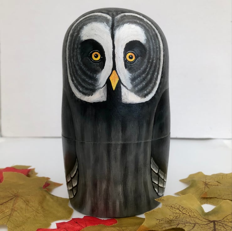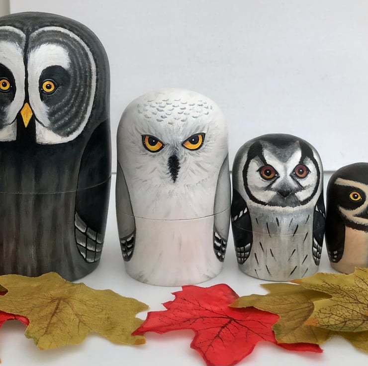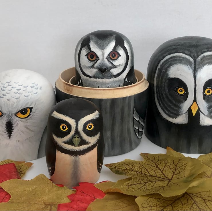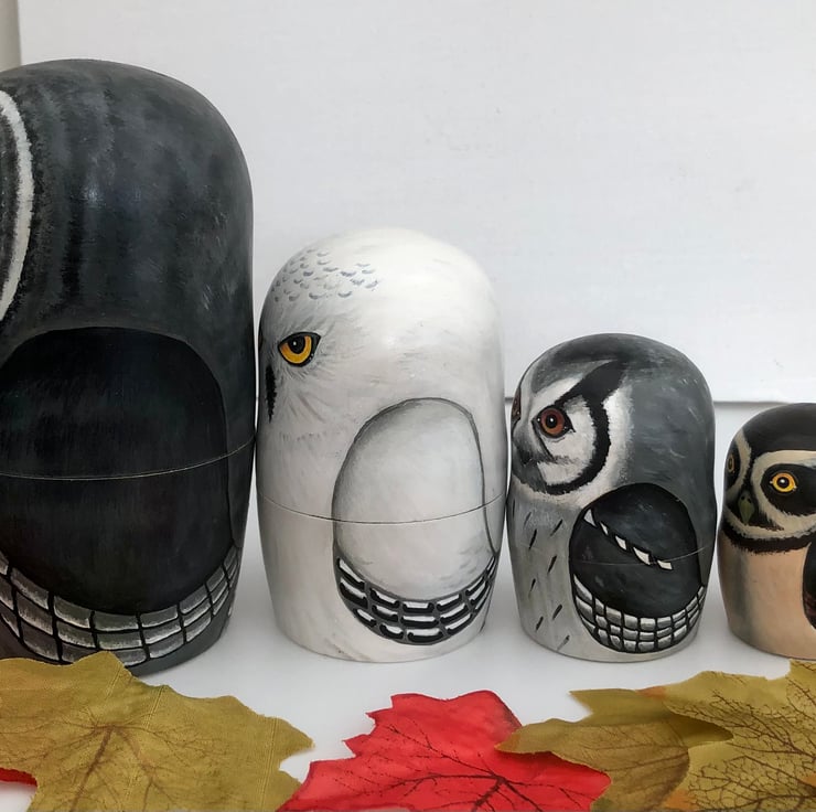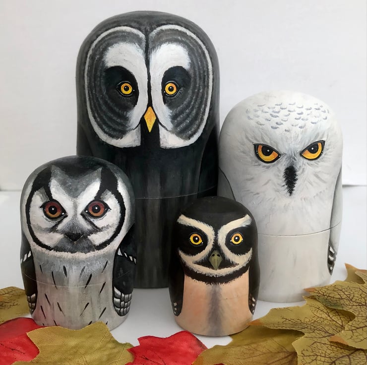 Owls of the World set of 4 nesting dolls include a Great grey owl, Snowy owl , Northern white faced owl and a Spectacled owl.