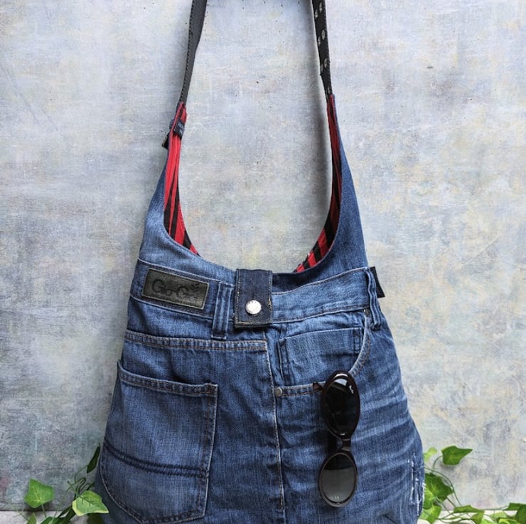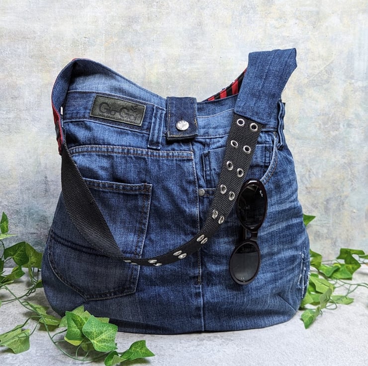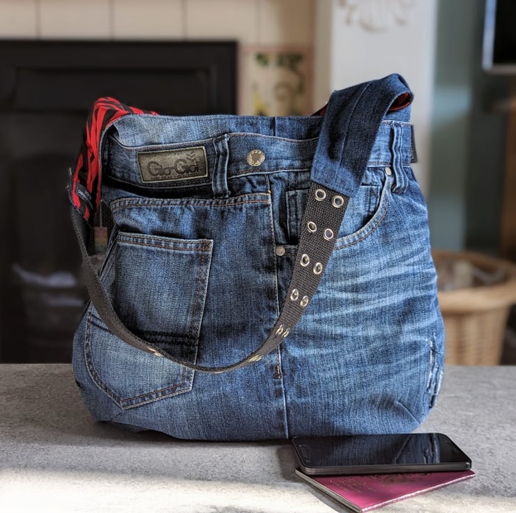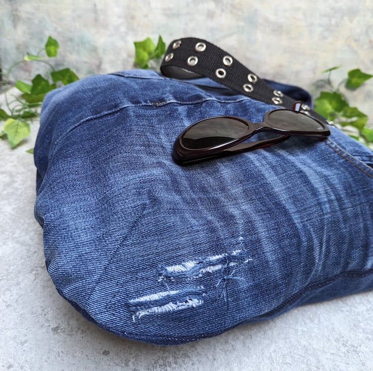 Old denim jeans have been used to make this roomy shoulder bag.
