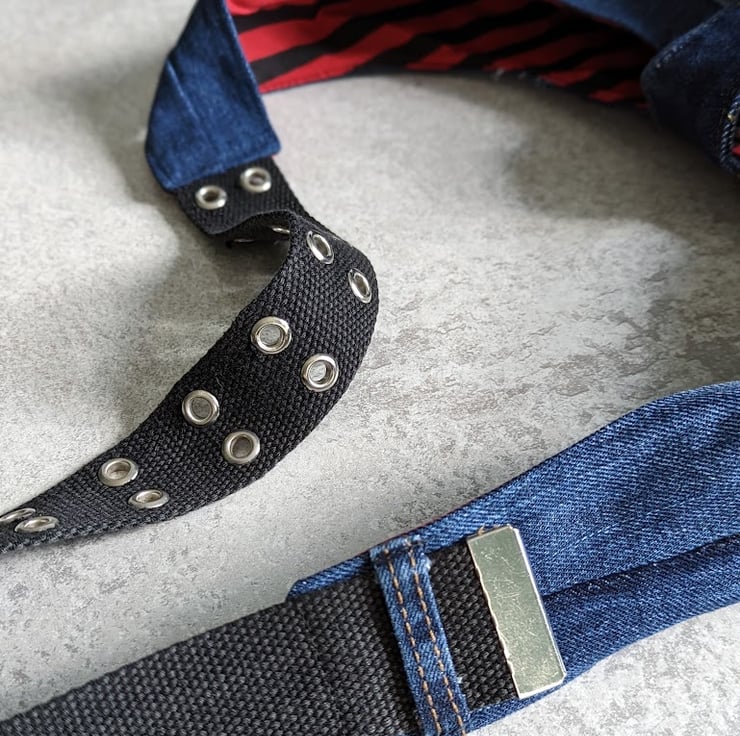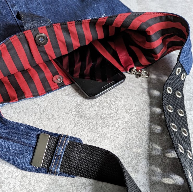 The shoulder strap is approx 38mm wide and has been made by re-purposing a section of a preloved black belt.