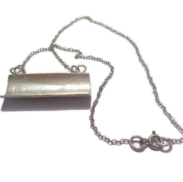The rectangle measures 4cm long and 18mm wide has been formed into a chunky half tube shape and attached to two sterling silver chains which each measure 22cm long each and fasten with a bolt clasp