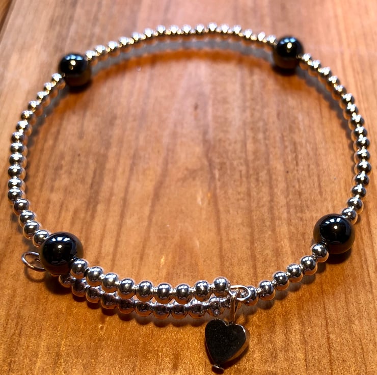 Four garnet beads with silver plated spacer beads on a memory wire bracelet with heart charm. Fits most adult size wrists.