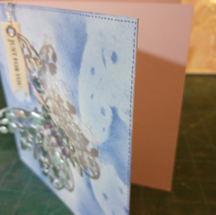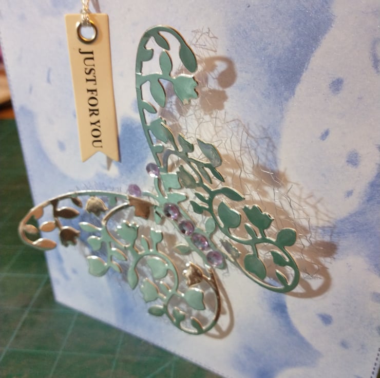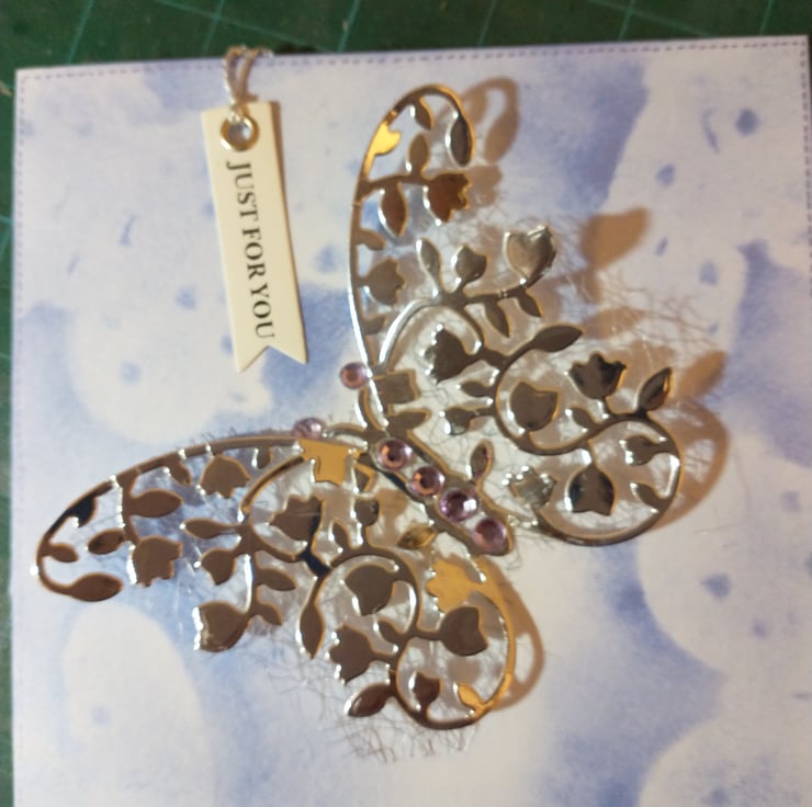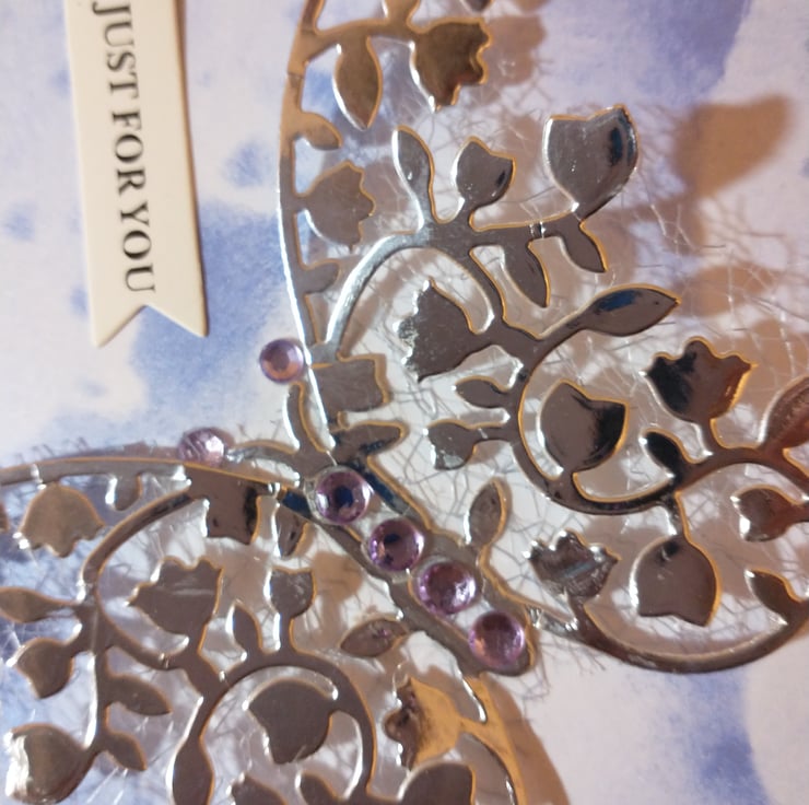 A completely handmade and uniquely designed card. Consisting of a beautiful butterfly die cut from silver mirri card mounted on top of a butterfly hand cut from silver web. Mounted onto lilac shaded pristine white quality card. Just for you tag dangles from silver cord. Embellished with lilac rhinestones.