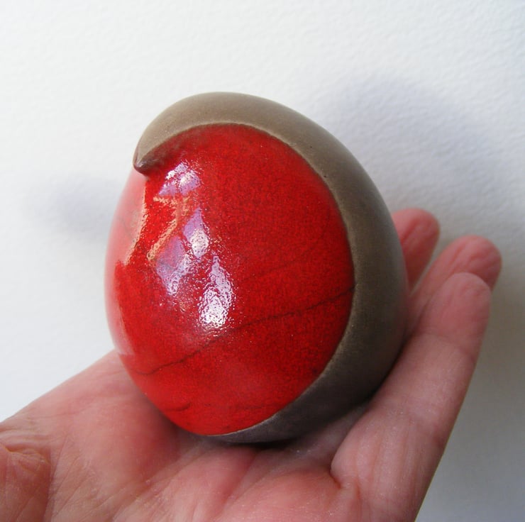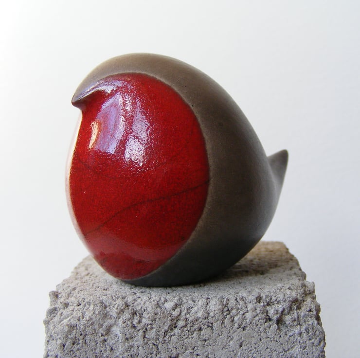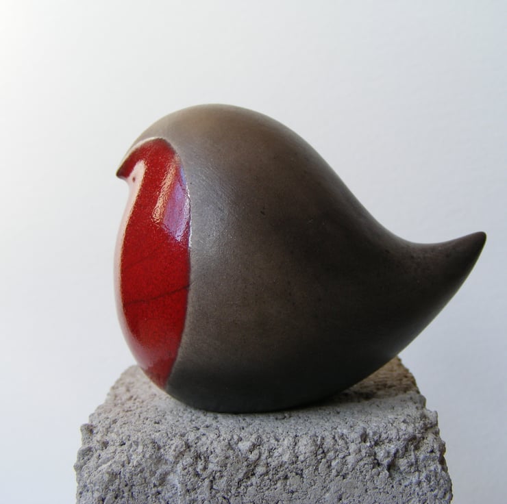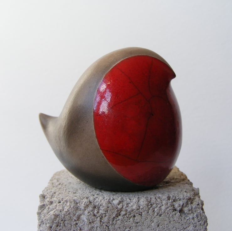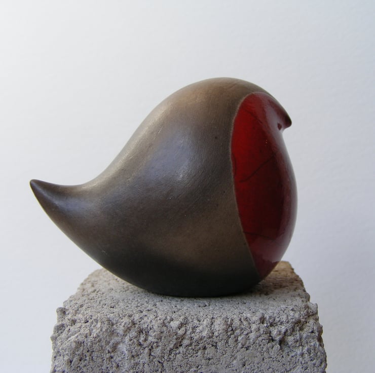 This bird is hand made and measures, 5cm high and 7cm long. It is made from white earthenware clay and first fired in an electric kiln, it is then has four layers of red glaze painted on the breast. It is then raku fired in a gas kiln, the dark part of the bird is unglazed so comes out a black/greyish colour after being smoked in sawdust, sometimes it has sawdust shadows smoked in, it is then lightly sanded and polished with beeswax.