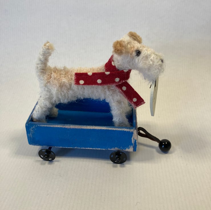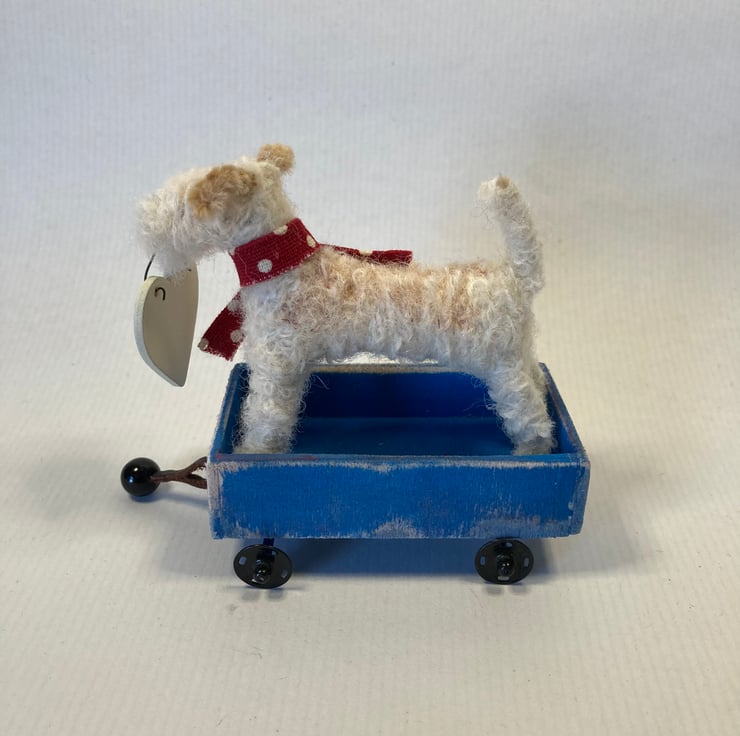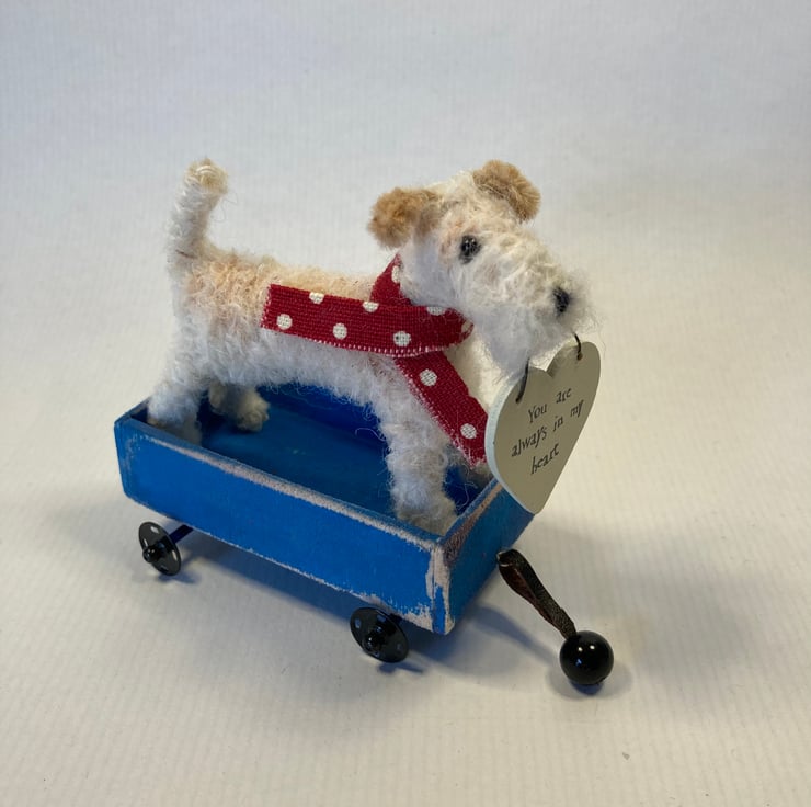 OOAK sculptured miniature dog in a pull along wooden trolley with wheels. All my animals are hand finished with eyes and noses and, if needed, wool whiskers! Roly has a wooden heart message which means