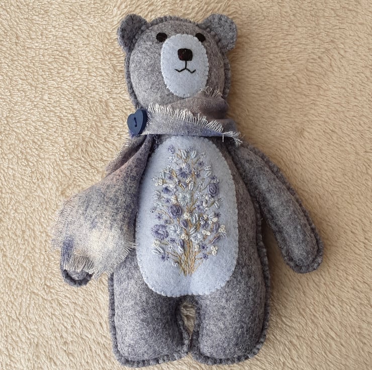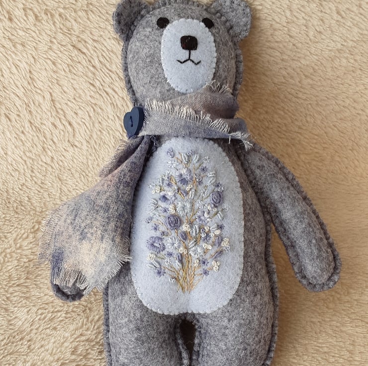 A hand embroidered and hand sewn wool felt teddy bear gift, designed and created by Bearlescent