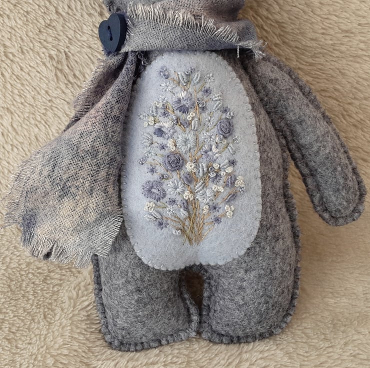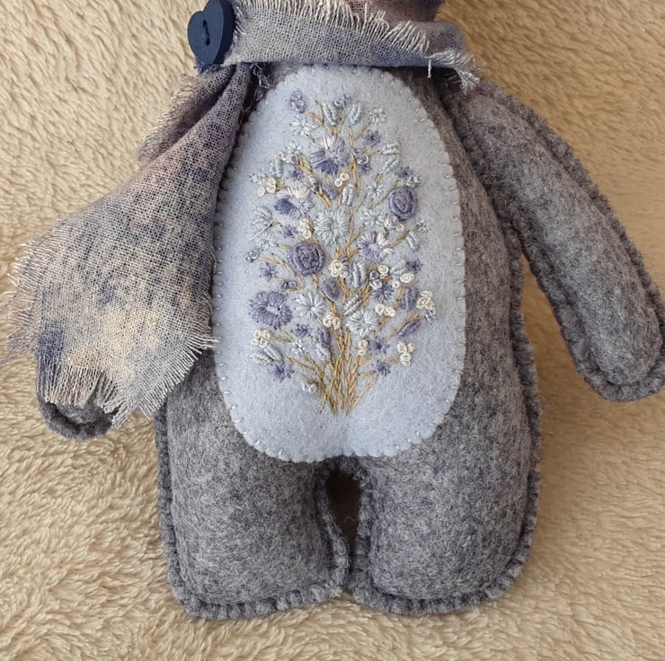 His contrast tummy area has been hand embroidered using various blue and green embroidery threads in a unique floral design onto powder blue wool felt.