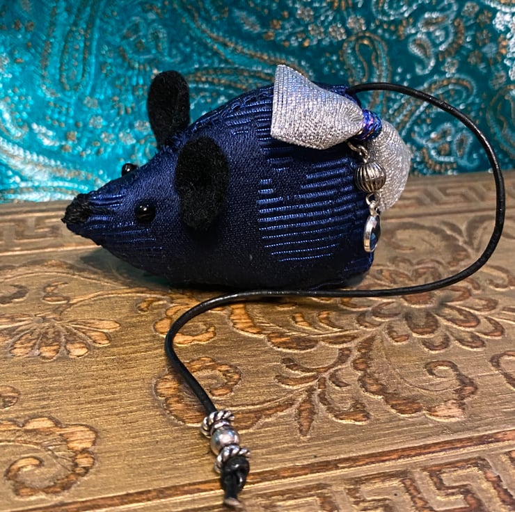 These fairytale mice are hand stitched to a pattern of my own design from scraps of vintage silk brocade. Their bodies are roughly 7-8cm long and stuffed with recycled polyester filling. They have felt ears, glass bead eyes, repurposed cord tails and hand embroidered nose and mouth. Each one is unique and adorned with a bow and repurposed or vintage beads and charms.