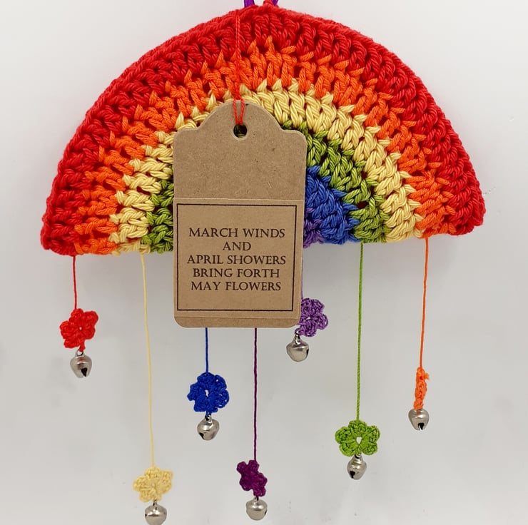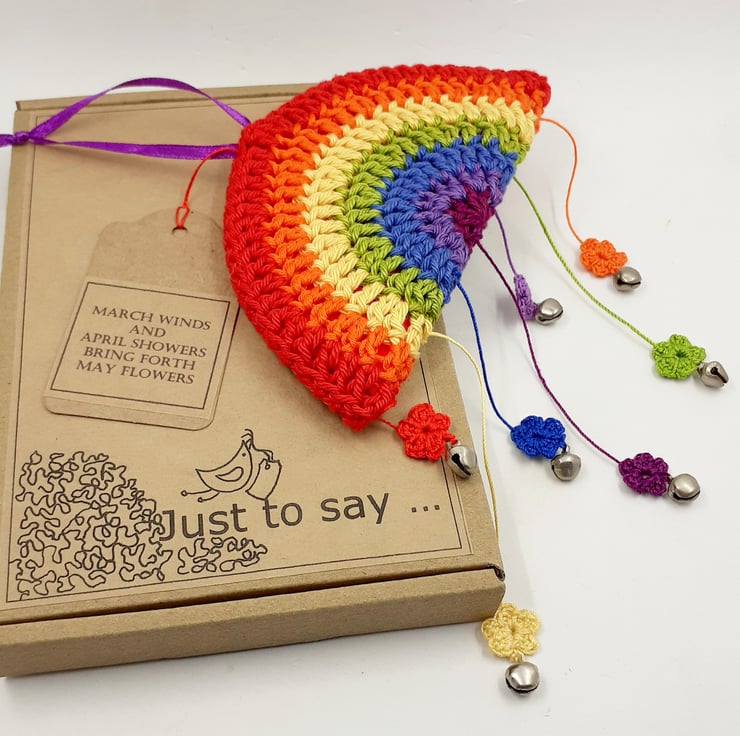 The tag has lines from the traditional English rhyme, 'March winds and April showers bring forth May flowers.' There is a narrow ribbon hanging loop. The rainbow measures approximately 12 cm wide and the whole decoration measures approximately 23 cm from the top of the hanging loop to the bottom of the violet flower. It comes wrapped in tissue in a labelled PIP (Postage in Proportion) box, all ready to be given or posted on.