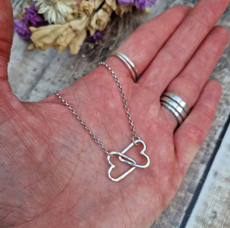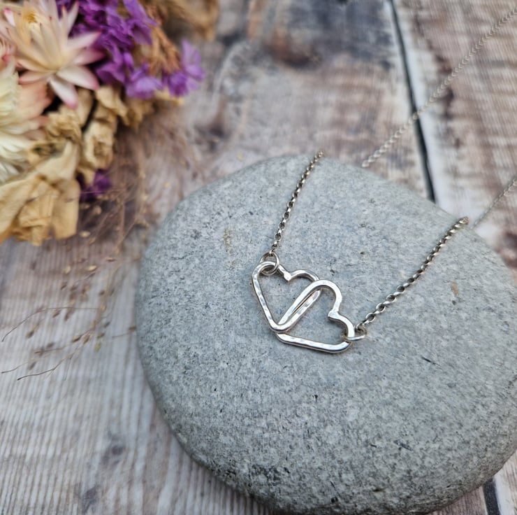 This handmade sterling silver necklace features a two delicate heart-shapes linked together, symbolising love and connection. Crafted from recycled sterling silver in Bristol, UK, the hearts are beautifully hammered to create a subtle texture that reflects light with every movement. Its open, airy design makes it a modern yet timeless piece that can be worn daily or saved for special occasions.