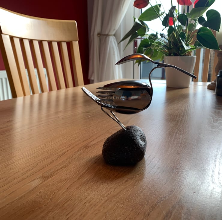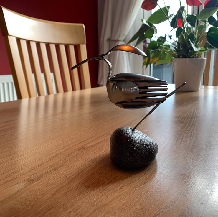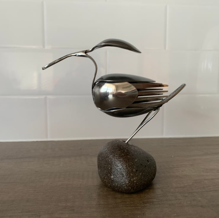 A stainless steel recycled cutlery bird mounted on Dumfries and Galloway sea washed stone. A one of a kind.