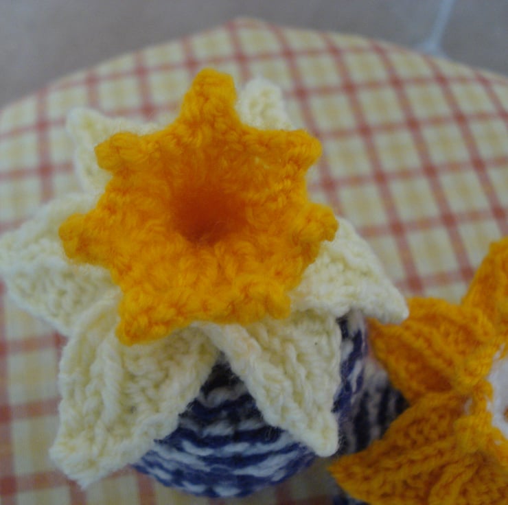 This is a pair of egg cosies, the base is knitted in cream and a dark plum Aran and there are crochet daffodils on top. These would go with the tea cosy which is already in the shop and would brighten up any breakfast table.