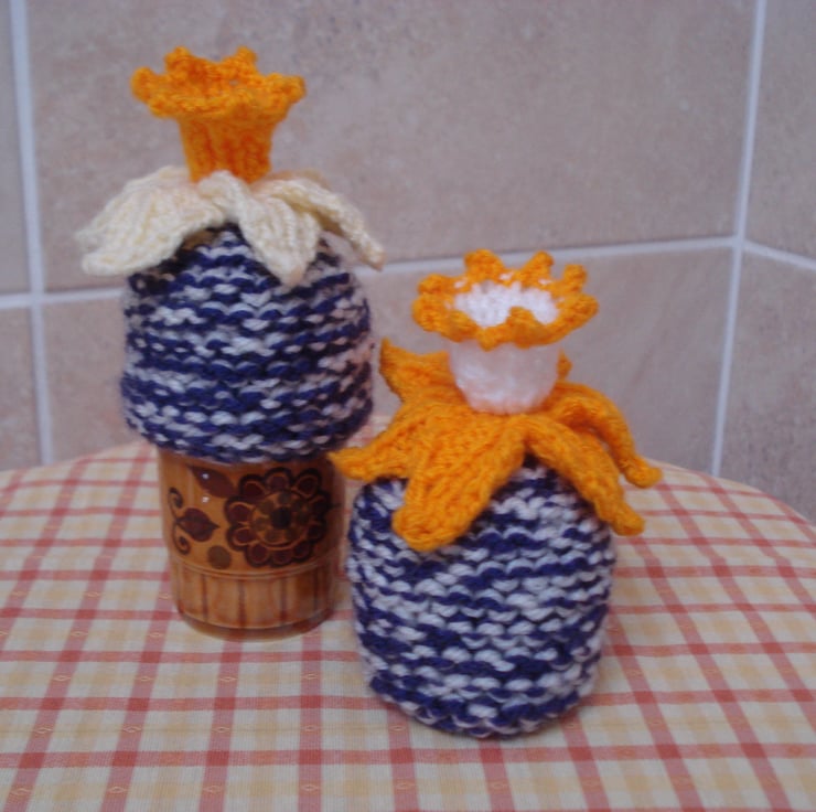 Pair Of Hand Knitted Egg Cosies With Daffodils Yellow And Orange (R903)