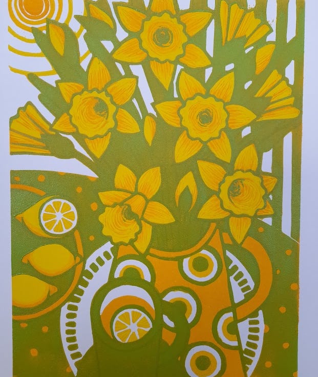 I use the reduction printmaking method in which the printable area of the lino is gradually cut away as each colour is printed and by the end there is no printable surface left. This is why the prints are limited editions as it is not possible to print any more. This is printed in 5 colours.