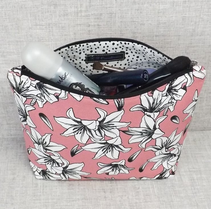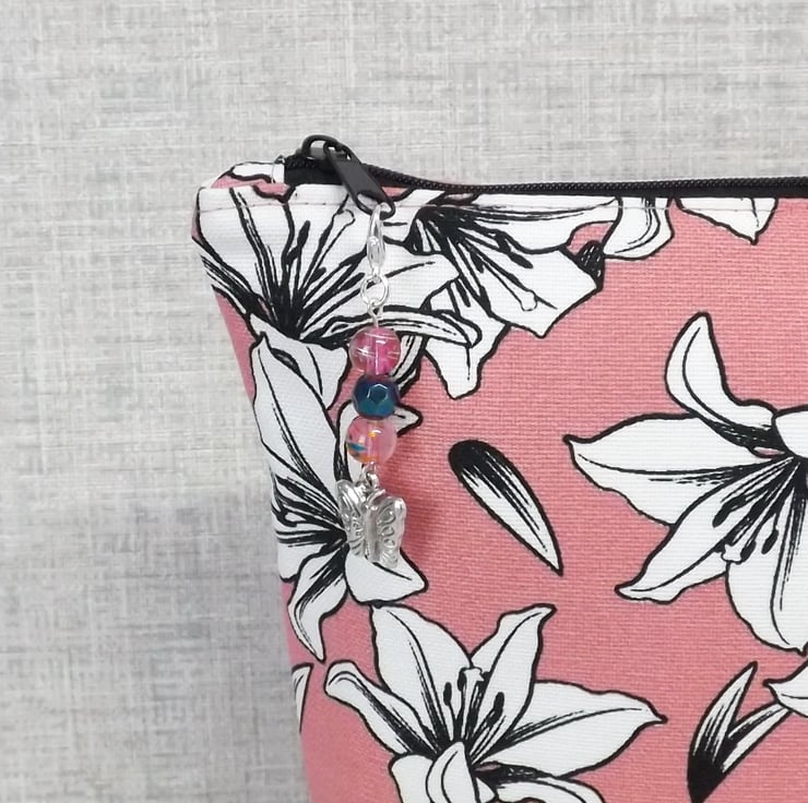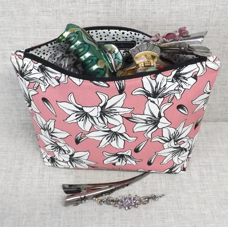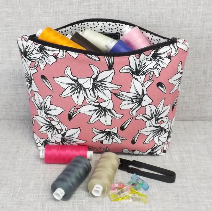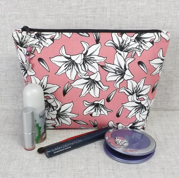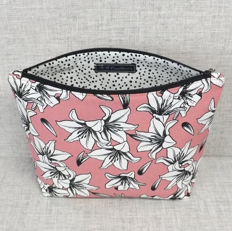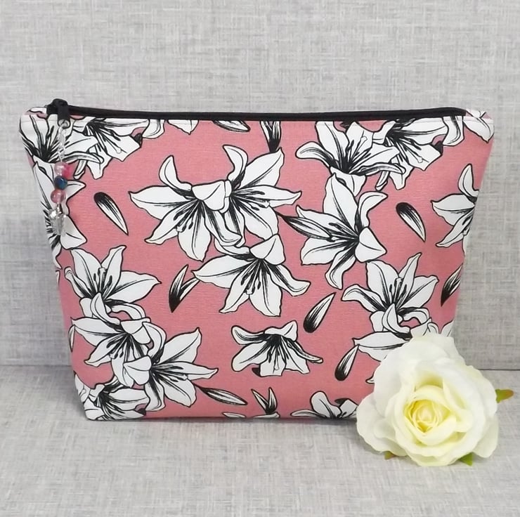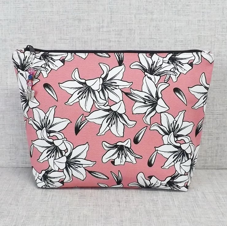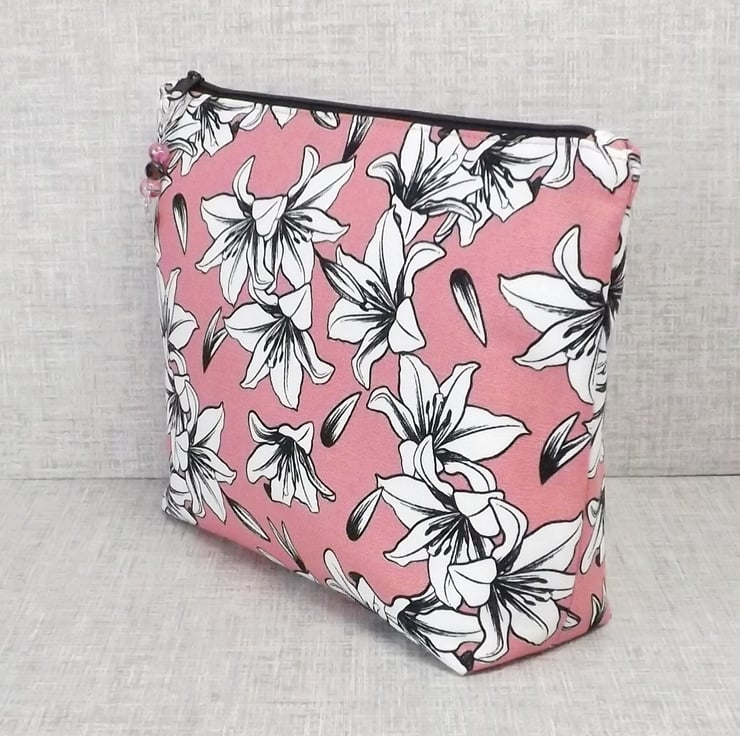 A large sized zipped pouch made from canvas fabric with lilies on a pink background.