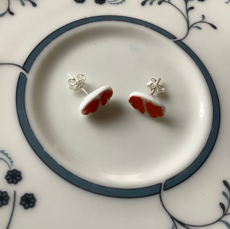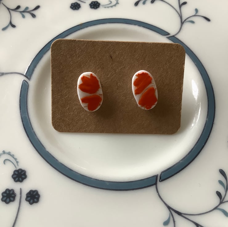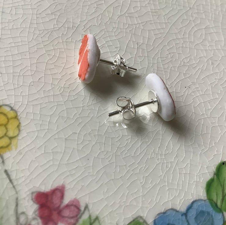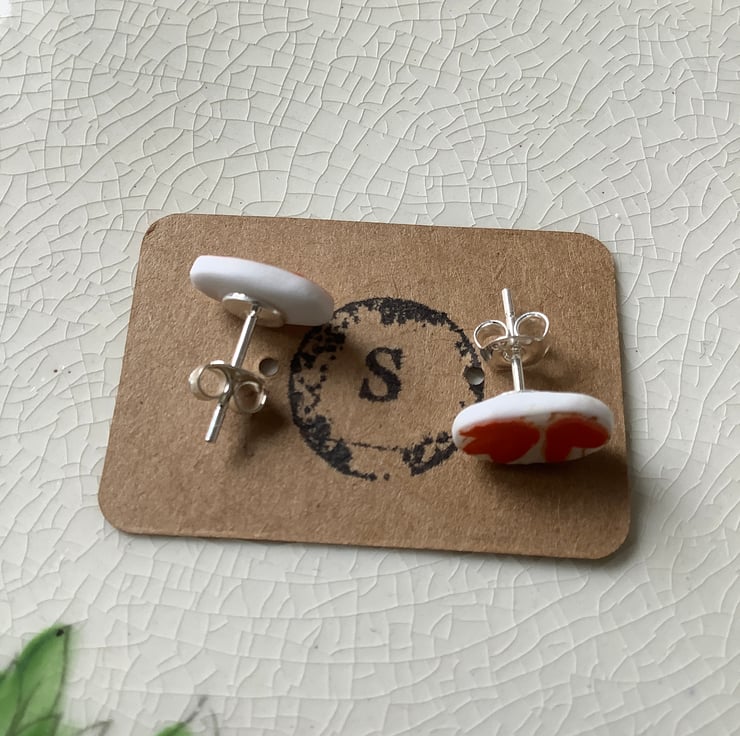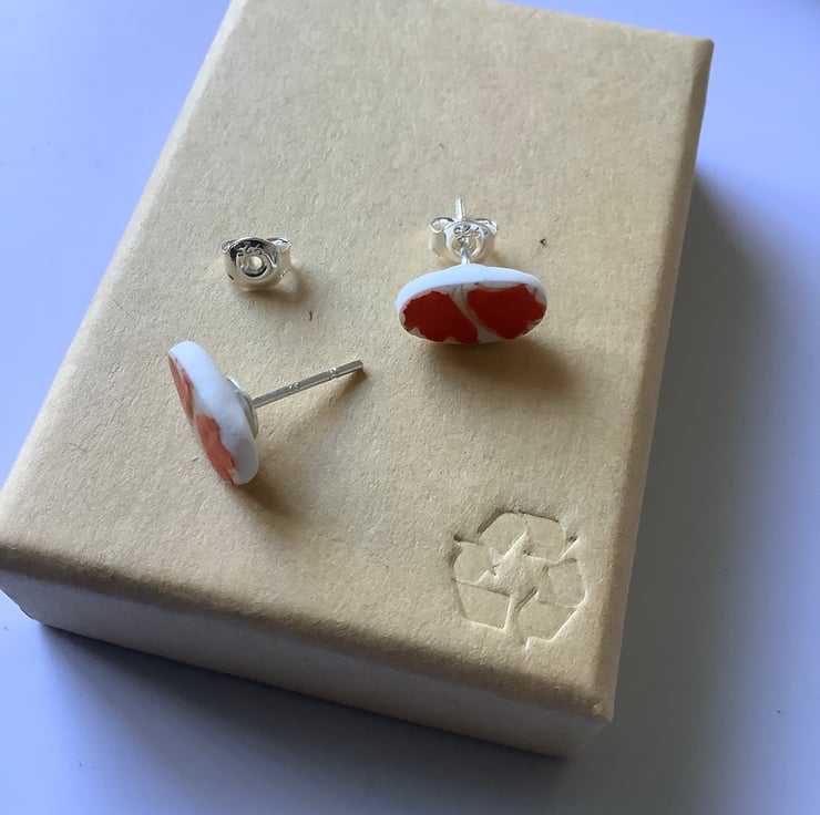 These tiny stud earrings are oval in shape and show parts of the orange hand painted flowers. Created from two small shards which I initially missed and found a couple years later. Abstract design, completely unique, one of a kind.