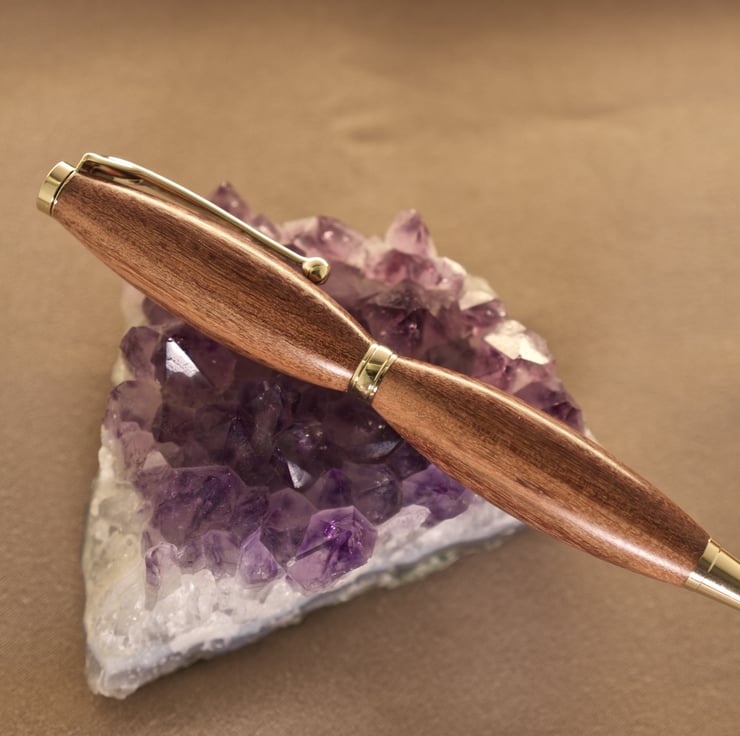 This yew wood pen is hand crafted on Sanday, Orkney Islands. Another of my gorgeous twist pens, it has yellow gold plate metal components, and like all my two-piece twist pens, the two halves of the pen are rotated in opposite directions to propel and retract the writing nib.
