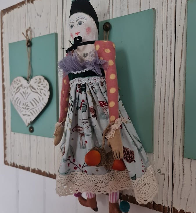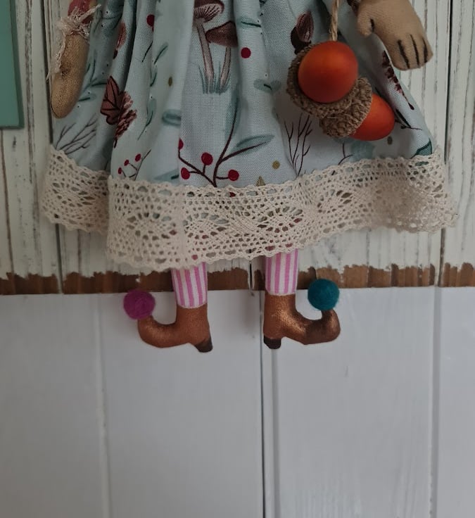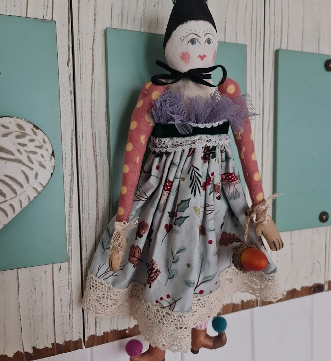 This little folk doll is hand and machine stitched in various fabrics as well as hand painted and drawn. Her dress is fastooned with woodland images, and trimmed with lilac tulle and cream lace, with wee pomm pom on the toe of her boots, in her hand she carries two little acorns to complete the woodland theme.