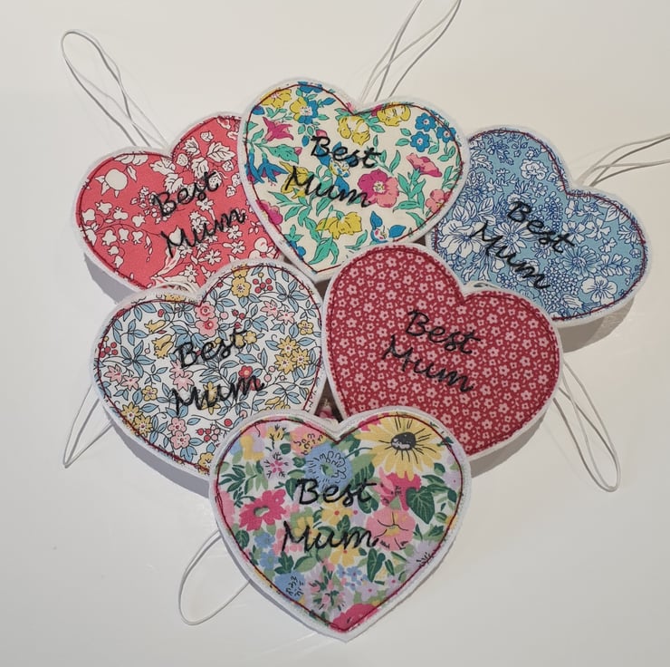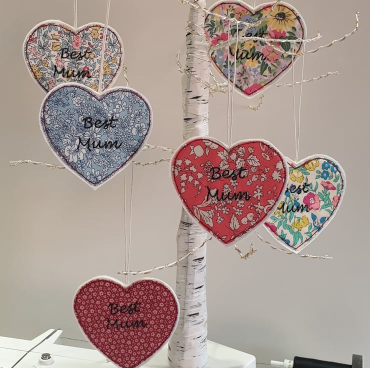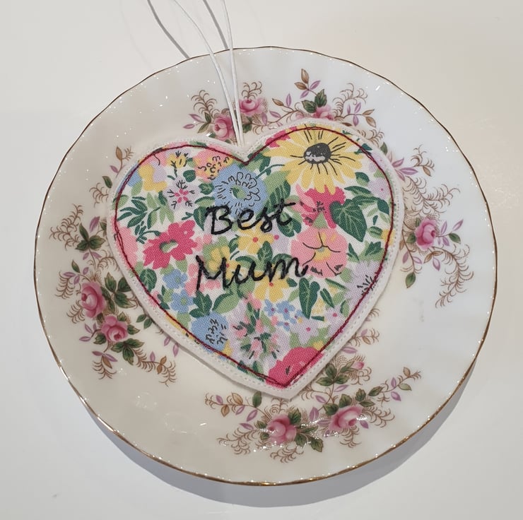 This sweet little hanging heart is made from lovely Liberty fabric. Backed with a layer of interfacing and stitched onto two layers of wool felt, it is sturdy but lightweight. It has the words Best Mum sewn using black thread and using a technique called free motion embroidery.