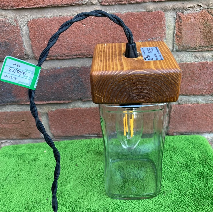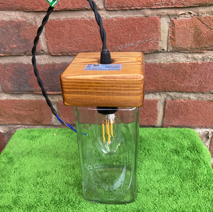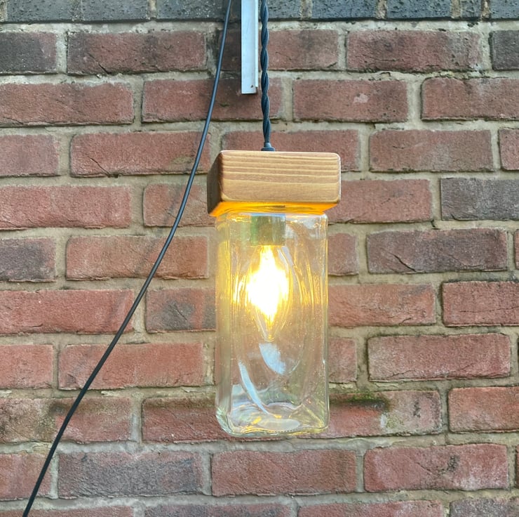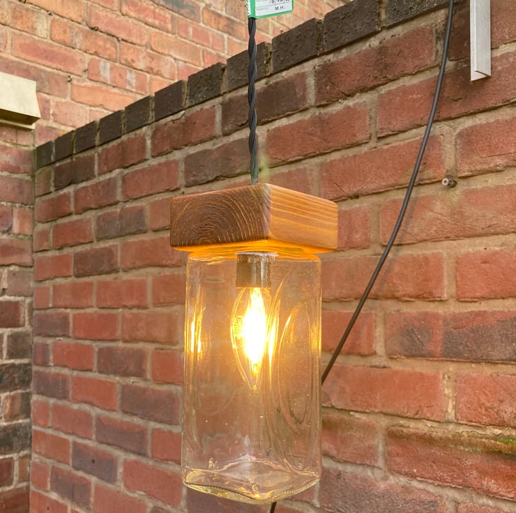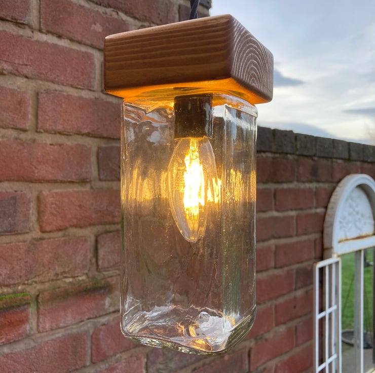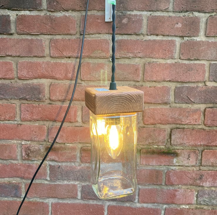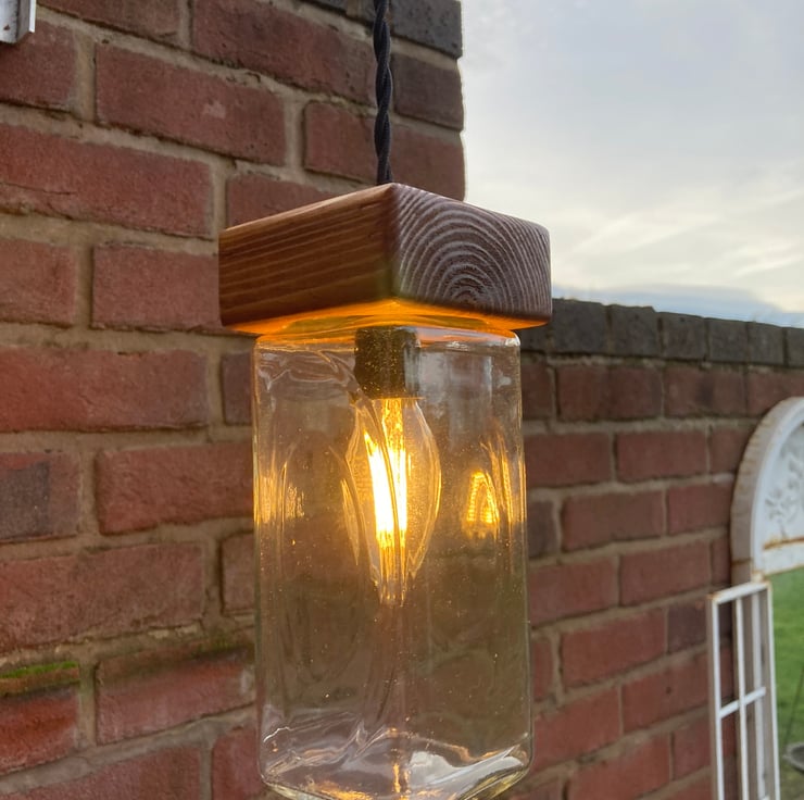 Bring an eco ambiance to your home with this quirky and unusual pendant ceiling lamp made from upcycled materials - apart from the electrical components. Made by fitting a glass supermarket coffee jar with a wooden cap made from reclaimed timber. The wood has been sanded, stained and French polished to give a nice protective sheen.