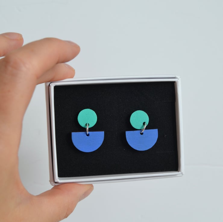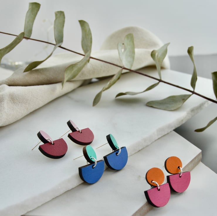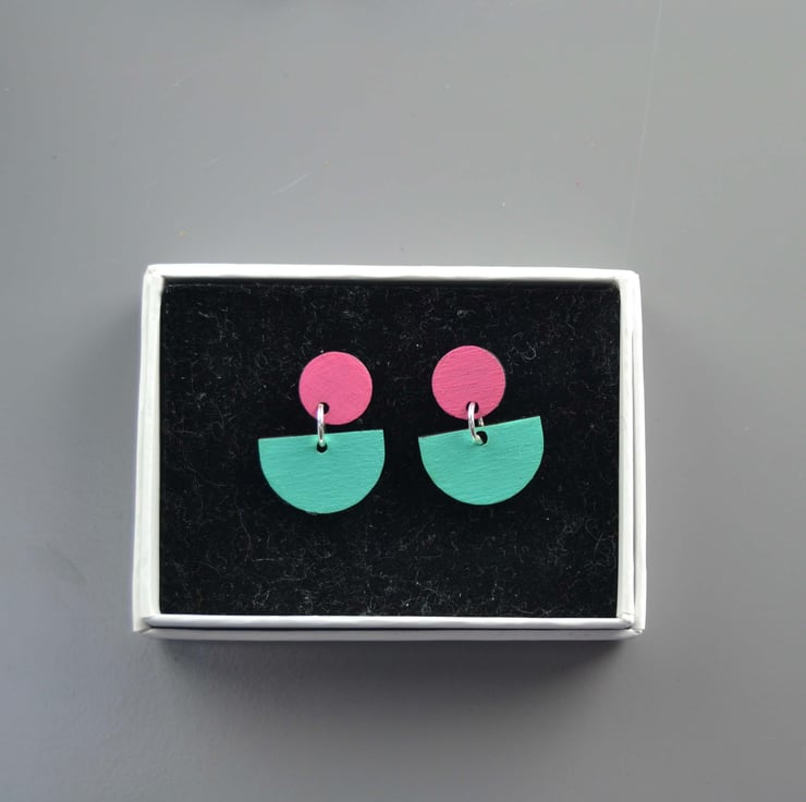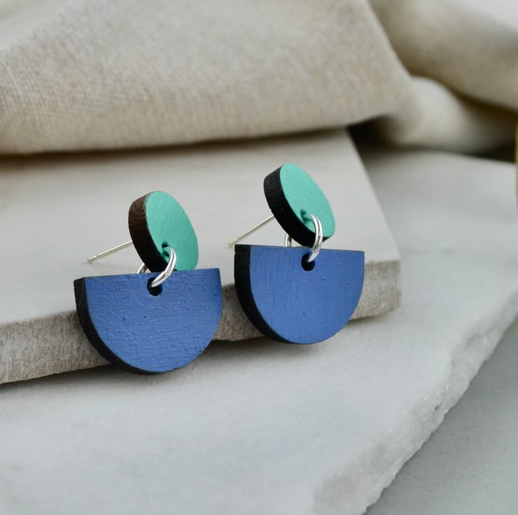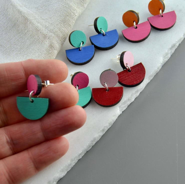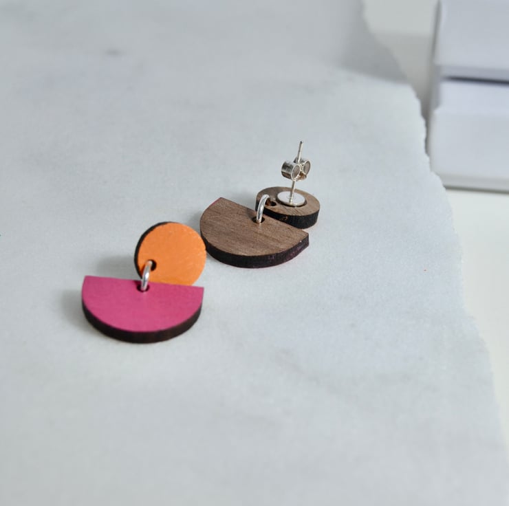 Colour pop wooden stud earrings. These two-part earrings fasten with a post and butterfly. The top part is a circle, with a semi-circle suspended from it. The two parts are both made from walnut wood, which I have lasercut for me. They are then handpainted and varnished. The back is left the natural walnut colour. The edges are dark from the lasercutting process, which gives a nice contrast.