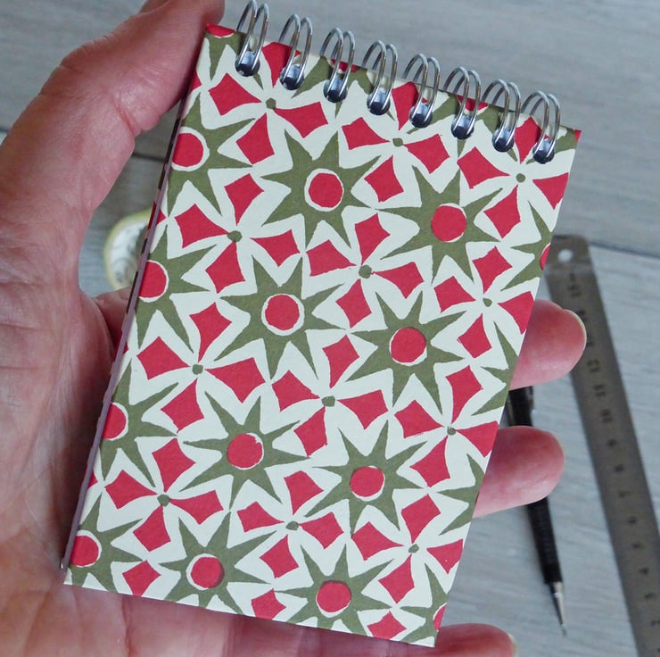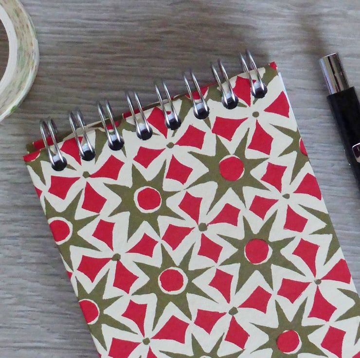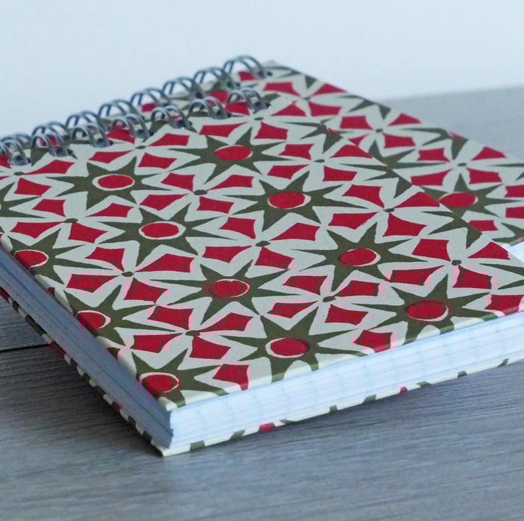 A handbound small spiral notebook made using 5mm grid paper with the sprial on the top, so it can flip over on itself and lie flat. With beautiful hardback covers, front and back, in a green and red star design, both hard covers are lined with paper and stamped with Bilberry and Wright name.