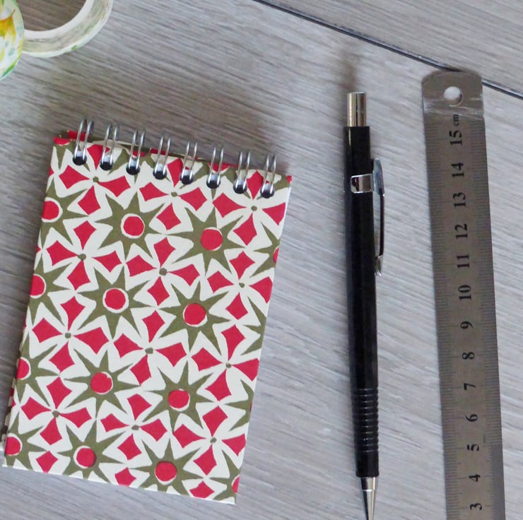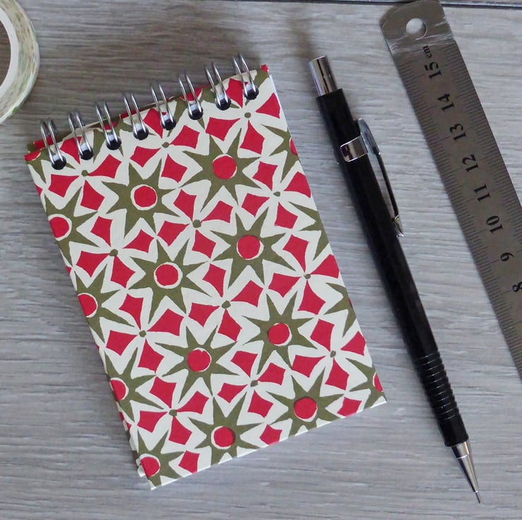 A7 Handmade Notebook with Spiral bind on the top in a green and red star design