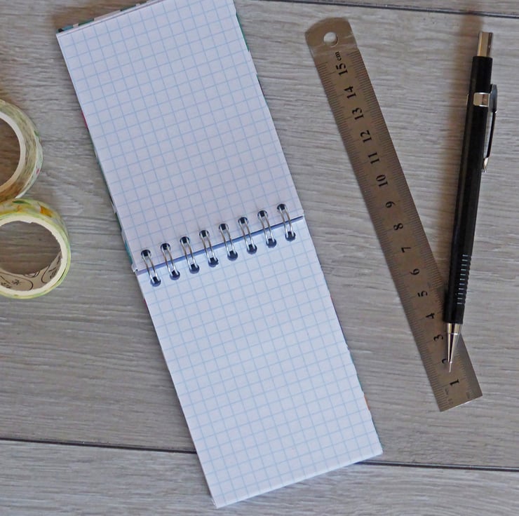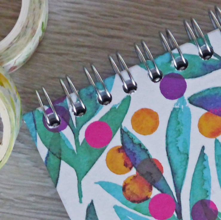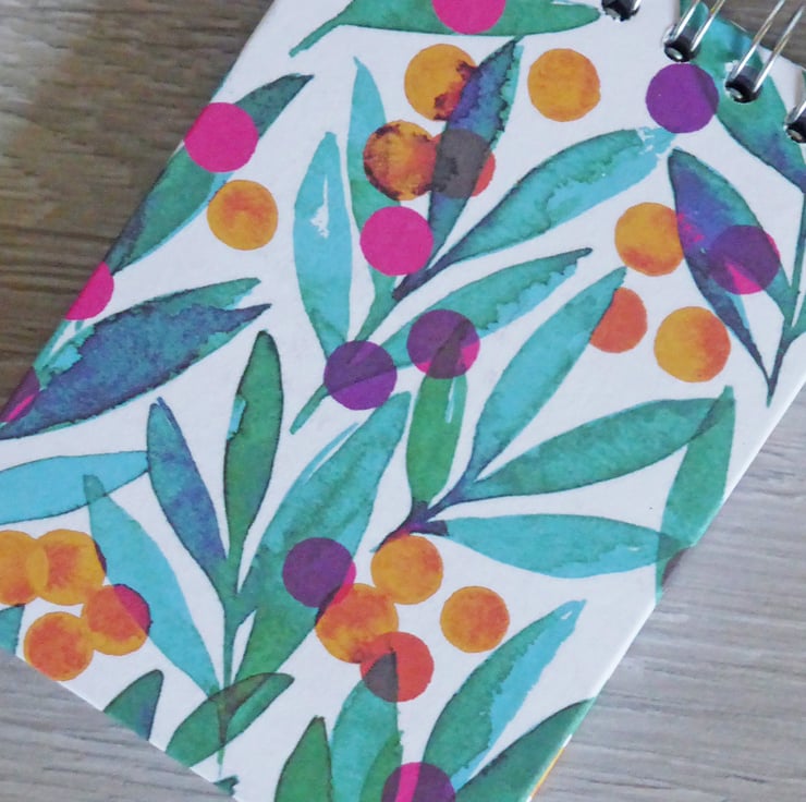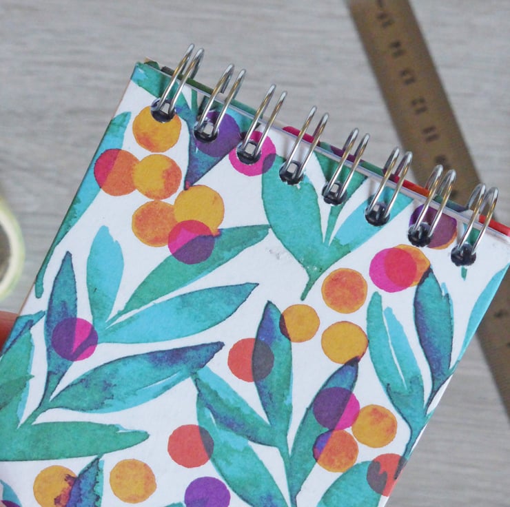A handbound small spiral notebook made using 5mm grid paper with the sprial on the top, so it can flip over on itself and lie flat. With beautiful hardback covers in an abstract floral design, both front and back covers are lined with paper and stamped with Bilberry and Wright name.
