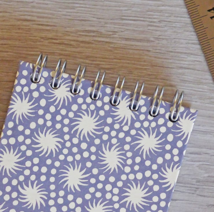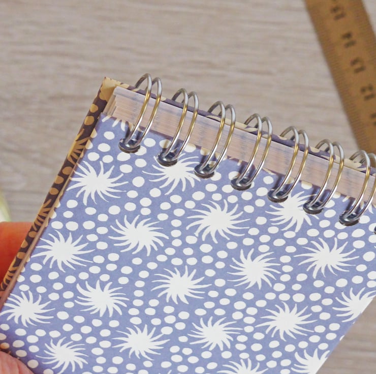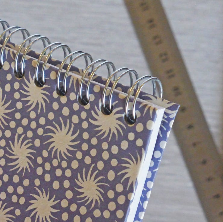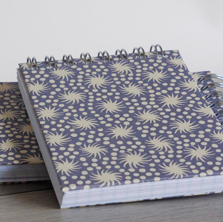 A handbound small spiral notebook made using 5mm grid paper with the sprial on the top, so it can flip over on itself and lie flat. With beautiful hardback covers in a cream and grey star and dot design, both front and back covers are lined with paper and stamped with Bilberry and Wright name.