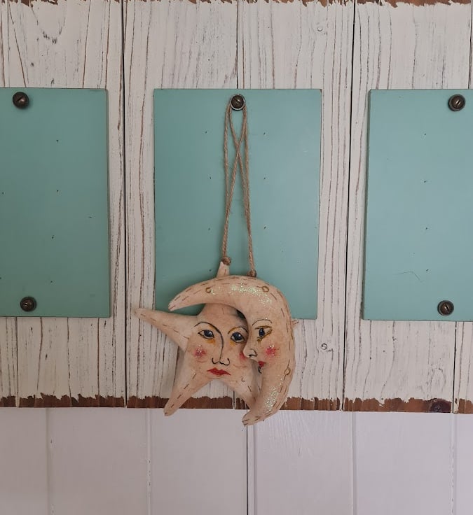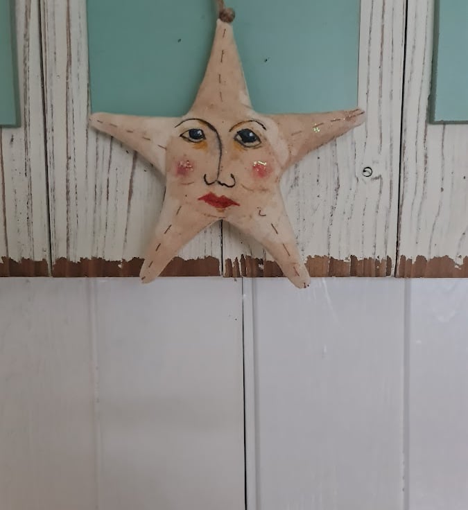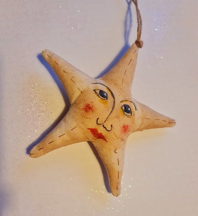 This sweet little star i hand and machine stitched in unbleached cotton and hand stained and painted. With glitter dabbed on its little cheeks and running stitch embellish to give a vintage feel.