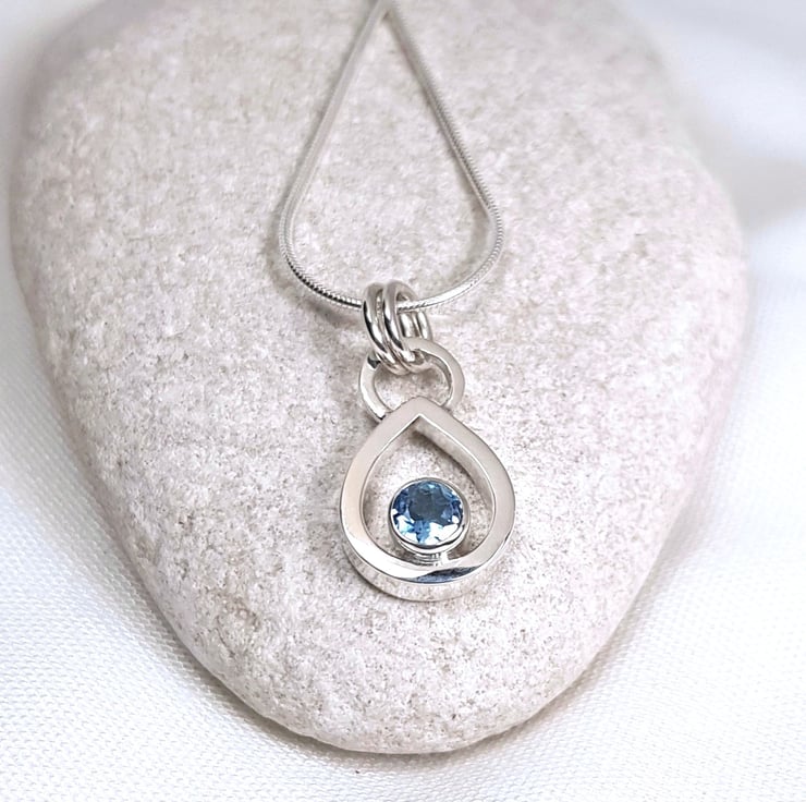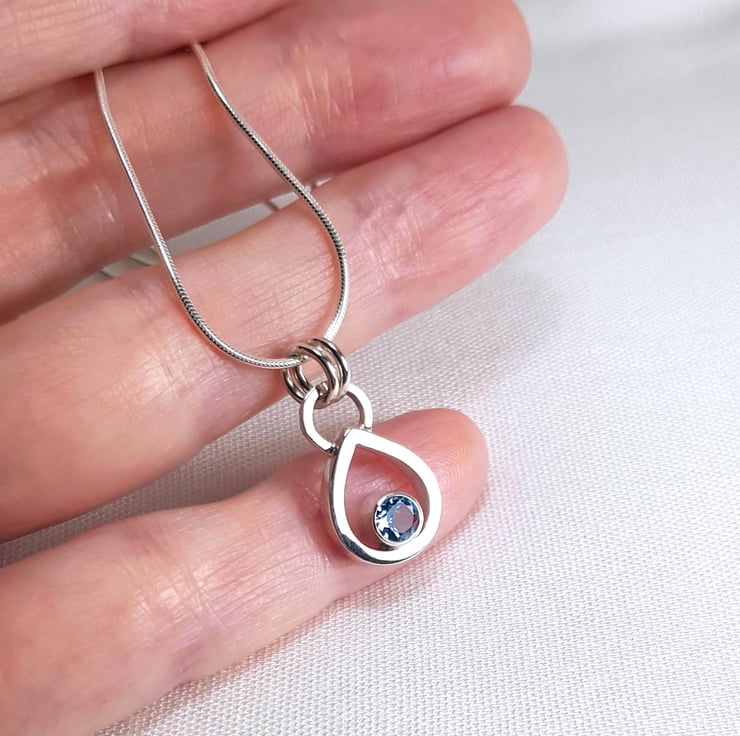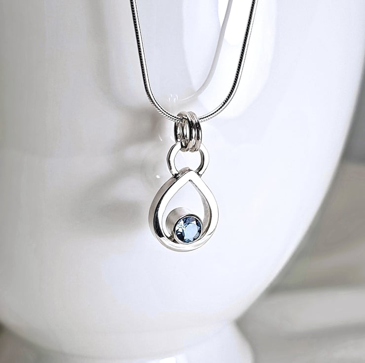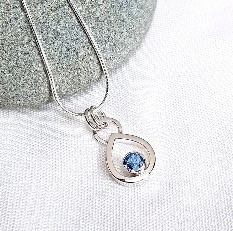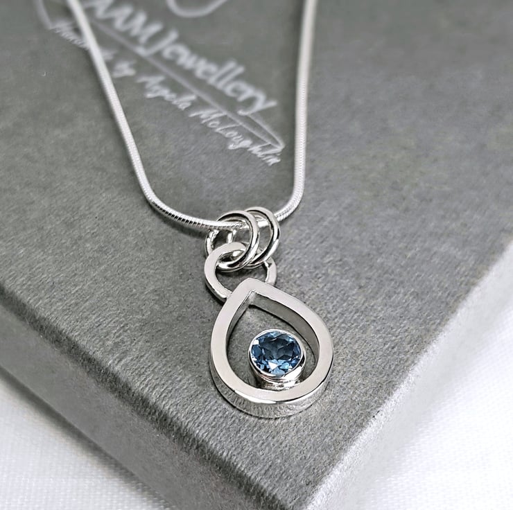Sterling silver necklace featuring a gorgeous 4.5mm genuine aquamarine. The beautiful gemstone is bezel set with an open back to let the light shine through. The teardrop pendant is finished to a high polish and hangs from a delicate 45cm (18 inches) mini snake chain.