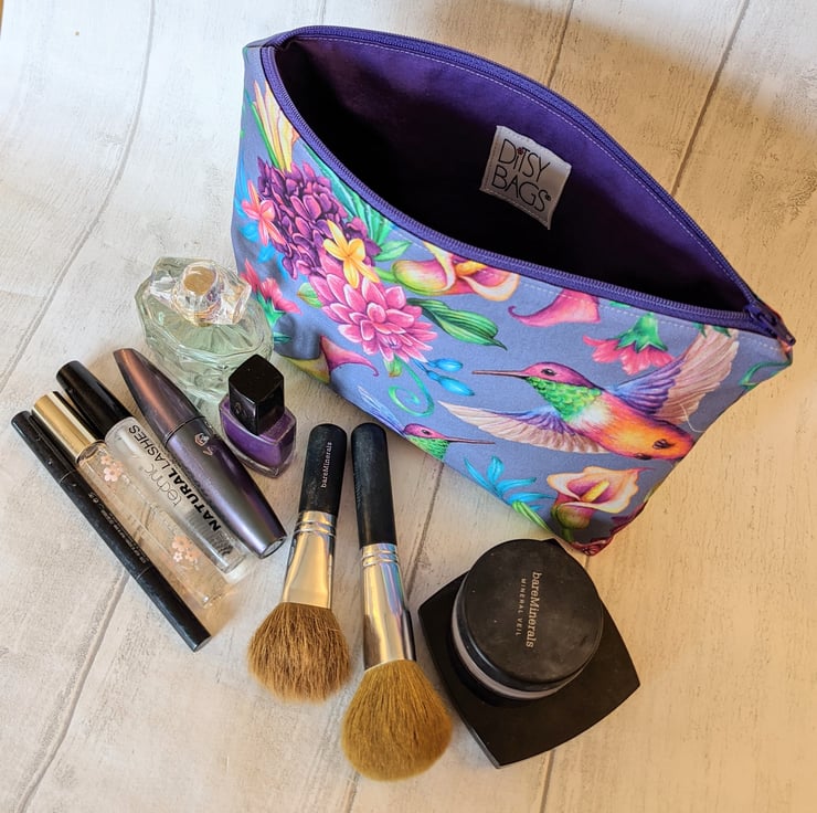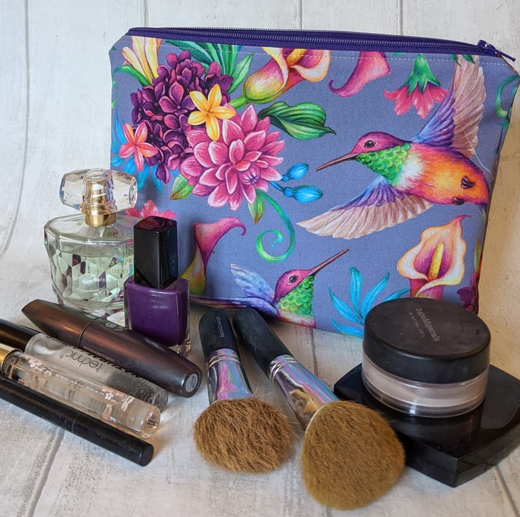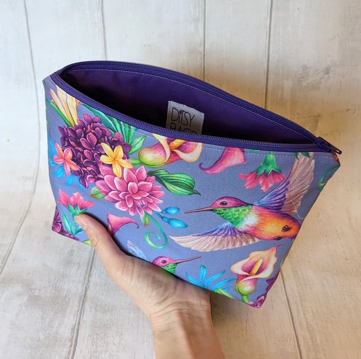 Cotton make up bag made with this super fun Hummingbird fabric. It is fully lined with a light cotton in a plain colour and a coordinating zip closure (colours vary).