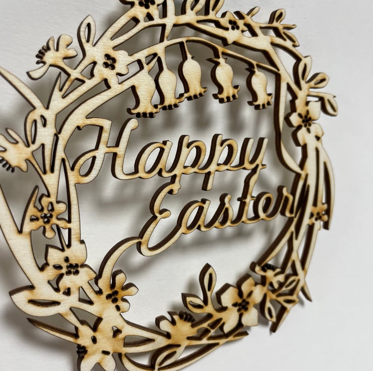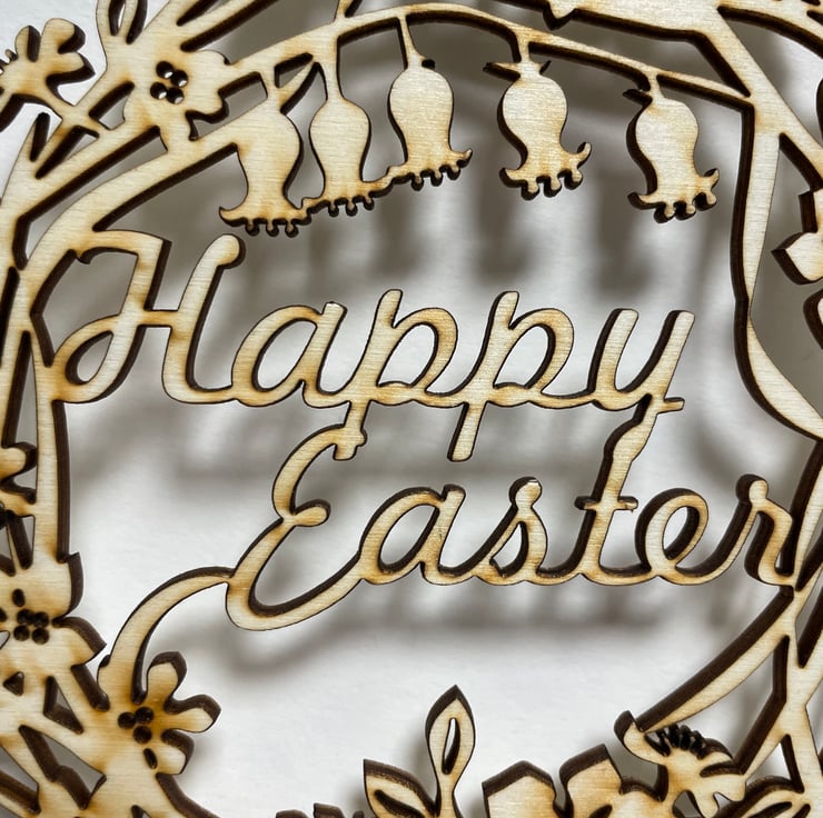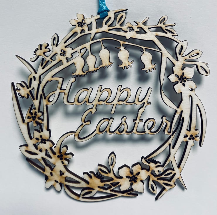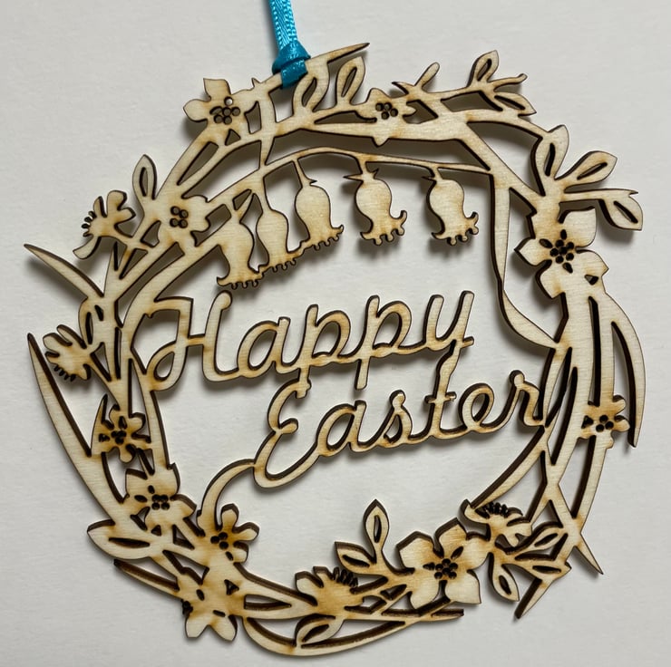 An original design incorporating the words 'Happy Easter'. This decoration is cut into 3mm plywood and finished with a 3mm satin ribbon.
