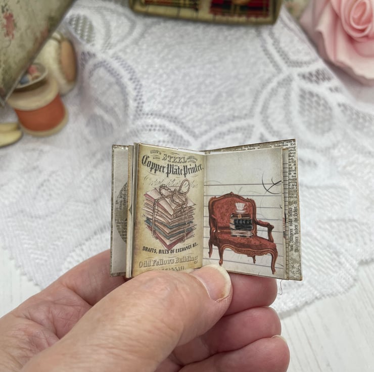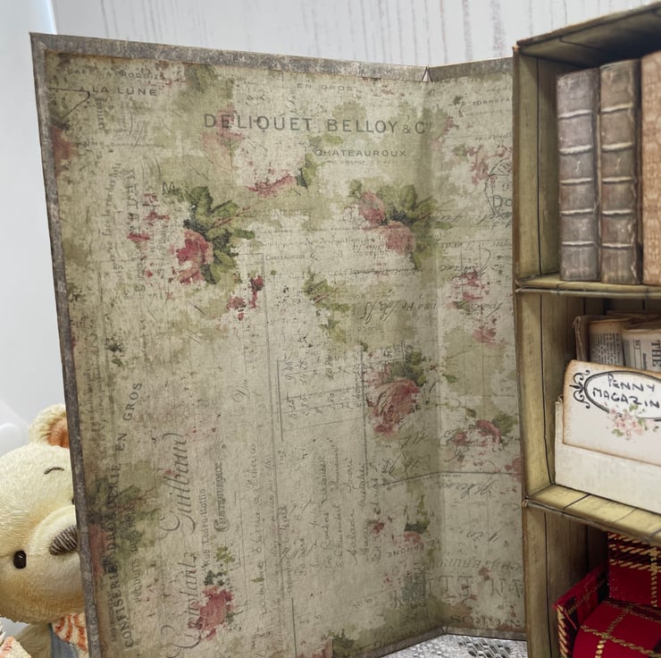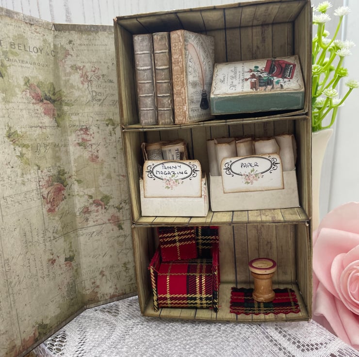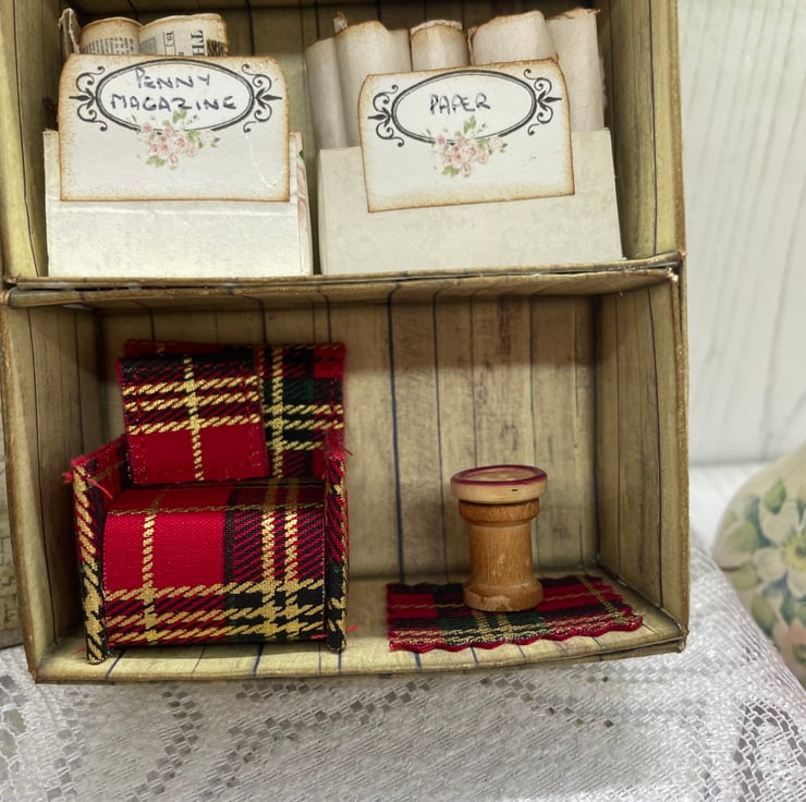 Bottom shelf forms a cozy reading nook, with handmade tartan armchair, matching rug and a side table made from a mini spool and button.