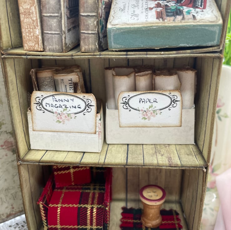 Middle shelf has boxes with Penny Magazines and plain paper rolls. Items on this shelf are fixed and cannot be moved.