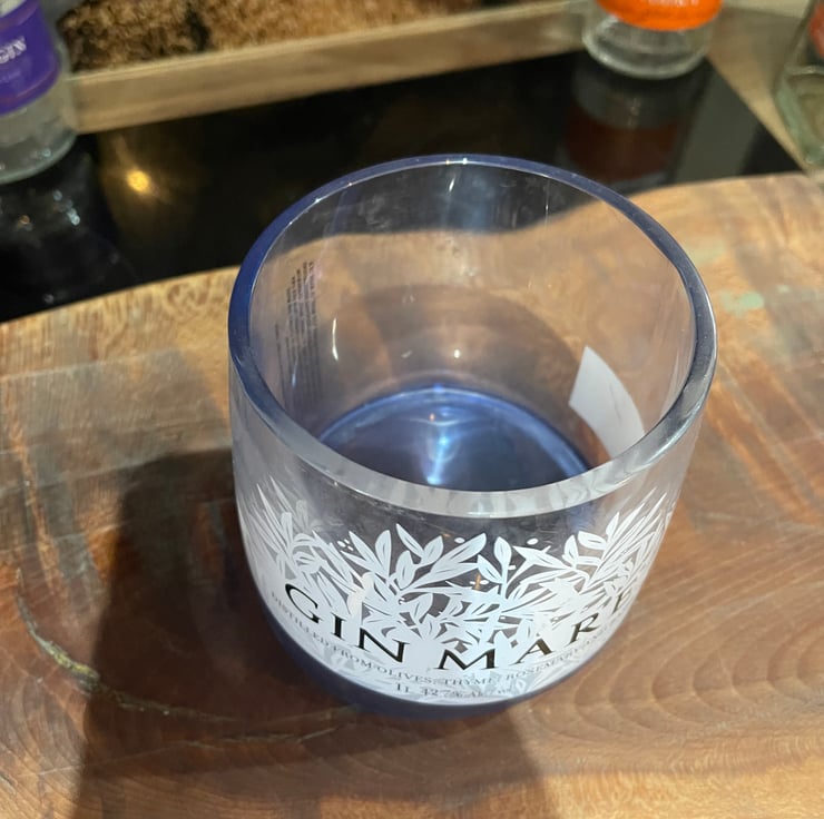 Made from a gin Mare glass, this is heavy and thick glass around 11cm tall