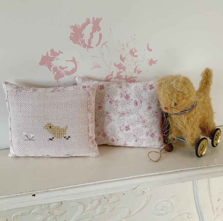 This beautiful cross stitchery makes a lovely decorative piece, featuring an embroidered chick. Display either in a bowl or sit on a shelf. Worked on a gorgeous chalk pink slubby linen. Edged and backed with a piece of vintage floral printed cotton.