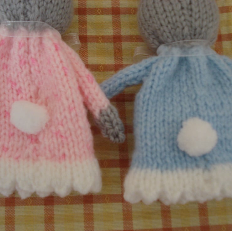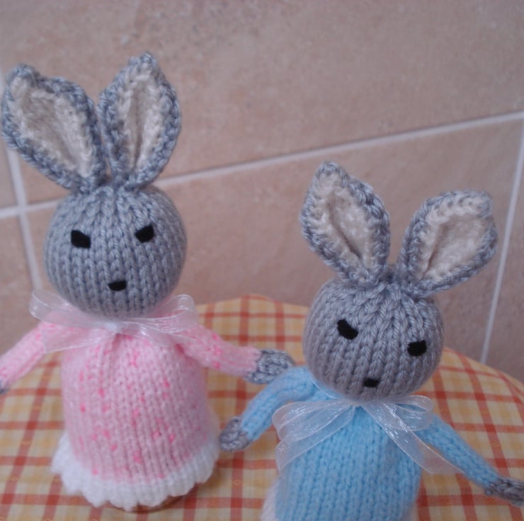 This is a pair of hand knitted rabbit egg cosies. They have stitched eyes and mouths and have little bows around their necks, turn them round to see a fluffy tail. Would make a great gift.