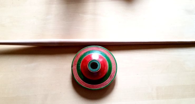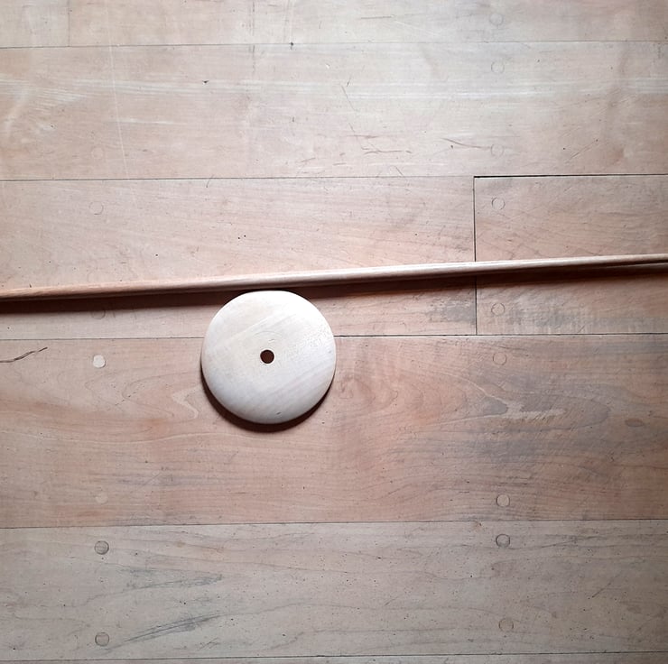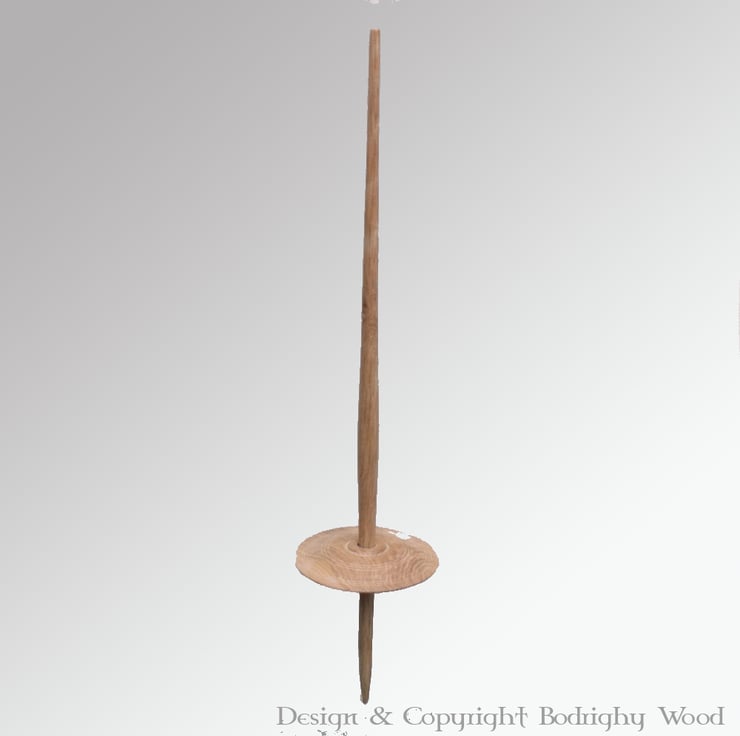 Not a drop spindle as such, this is used traditionally sitting cross legged with one end on the floor. It is 30" long and the whorl is not fixed but jammed so that it can be put at either end at a different position giving a different spin. Not perhaps the normal style seen but a lovely traditional style of spinning. I can provide these in either plain wood or coloured.