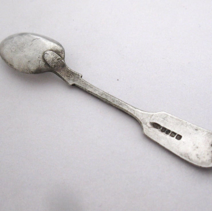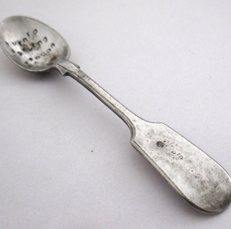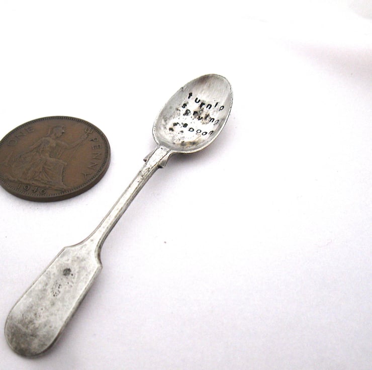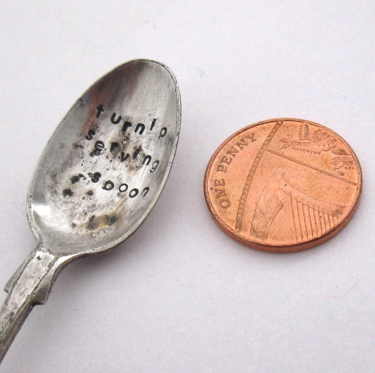 PLEASE NOTE this is NOT really a serving spoon - it has the shape and proportions of a full-sized tablespoon but in reality it's a tiny (9.3cm) antique 'fiddle pattern' silver-plated spoon, rather battered and worn, to which I've added the hand stamped wording 'turnip serving spoon' in tiny wobbly 1mm lower-case sans serif lettering.