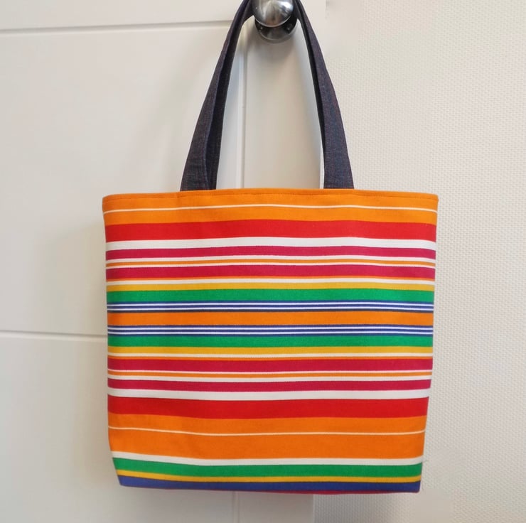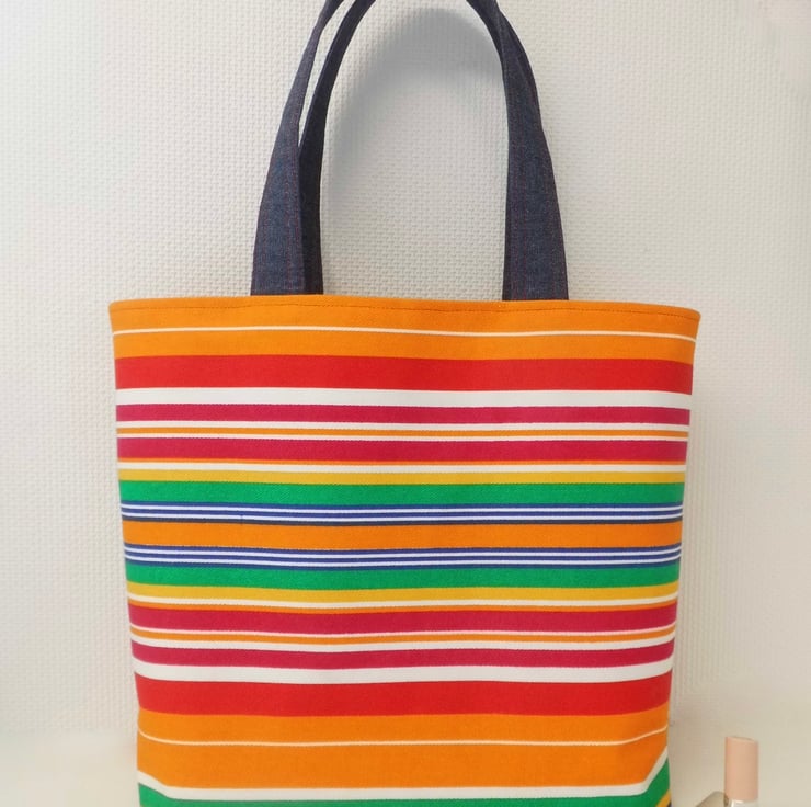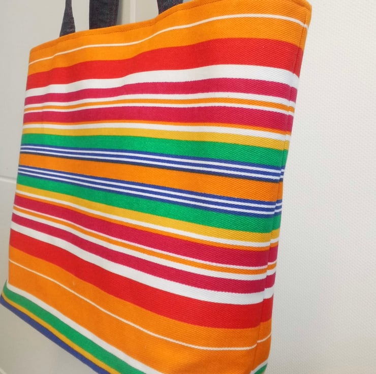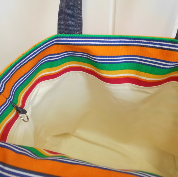 I have made this bag using a heavy weight cotton fabric in brightly coloured deck chair stripes of orange, red, blue green and yellow. It is faced at the top with the same fabric for a professional finish and then the lower half is lined with cream polyester/cotton. I have inserted a key ring in one of the side seams using a denim loop, handy for clipping your purse or keys safely. Fully lined so there are no raw edges inside.