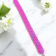 An elegant, contemporary bracelet made with gold splashed sky blue and matt gold Czechoslovakian glass GemDuo beads. Hand stitched together with matt gold Japanese glass beads and fitted with a strong, magnetic gold-plated clasp, which requires pulling apart and does not easily ‘snap’ open. The bracelet is 1.75cm wide.