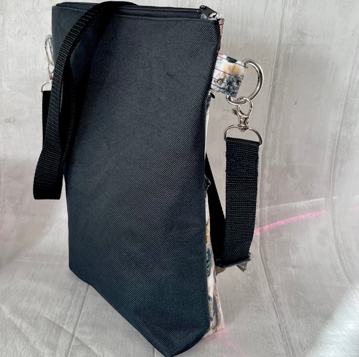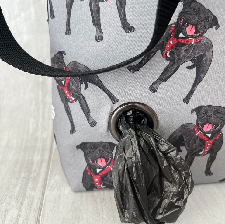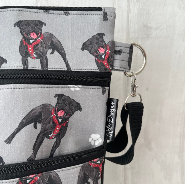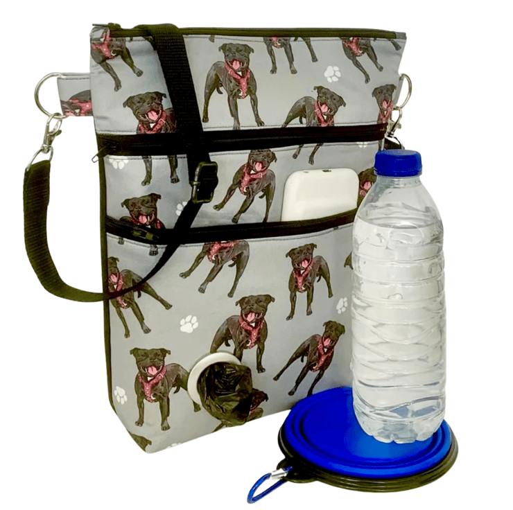 This Staffordshire bull terrier cotton print cross body dog walking bag has a plain black waterproof nylon canvas back and is lined with a black waterproof nylon lining. This handy bag will hold all your essentials for walking your dog.