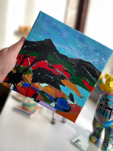 This original work is called, "Lonely Peaks" in honour of our magnificent landscapes that give us joy all year round. The dark, towering mountains overlook the valley below, in an almost protective way. This would make an ideal gift for any art lover on any occasion.