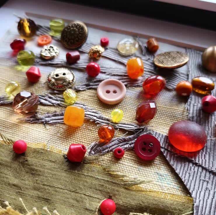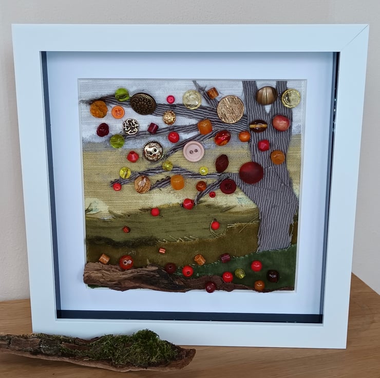 You know all those spare buttons we have in the drawer 'just in case' that we never do anything with? Some of them are finally being put to good use in this picture of an autumnal tree. Buttons are combined with spare beads and remnant fabrics.