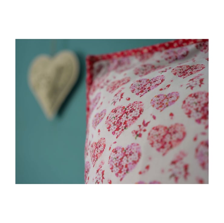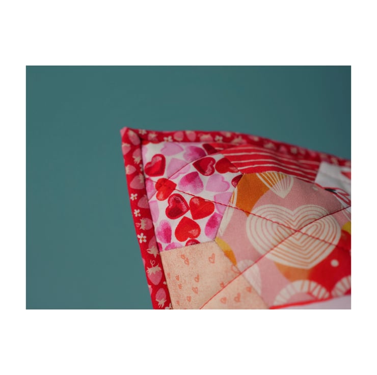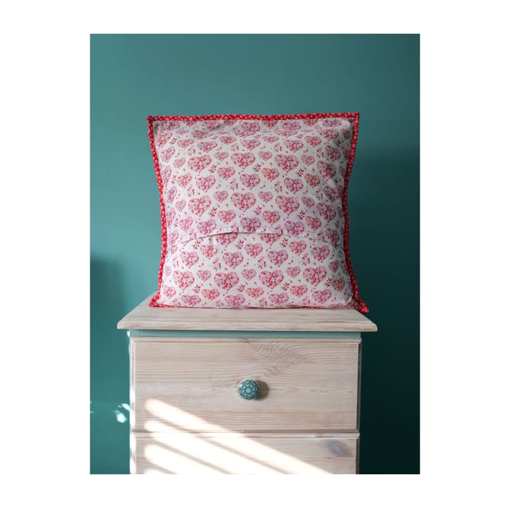 Quilted English Paper Piecing Cushion Cover made from 56 hexagons. Very cute design with hearts. Fits the standard cushions 43cm x 43 cm. ( cushion is not included ). Perfect gift for the upcoming St Valentine’s Day