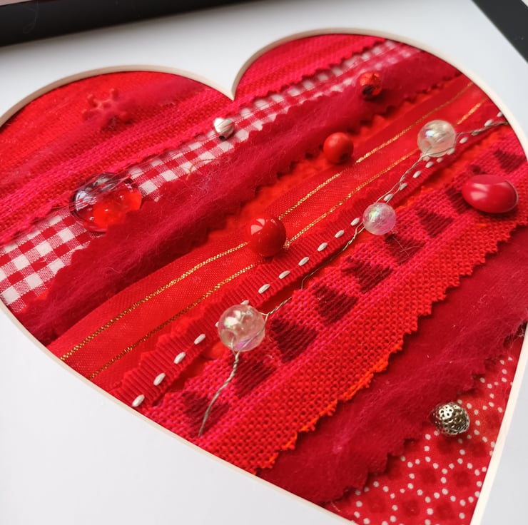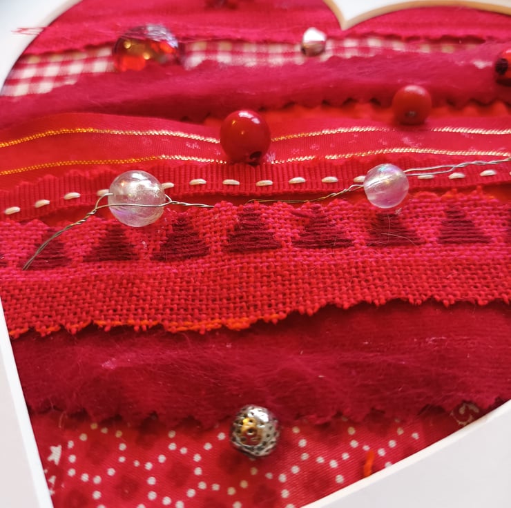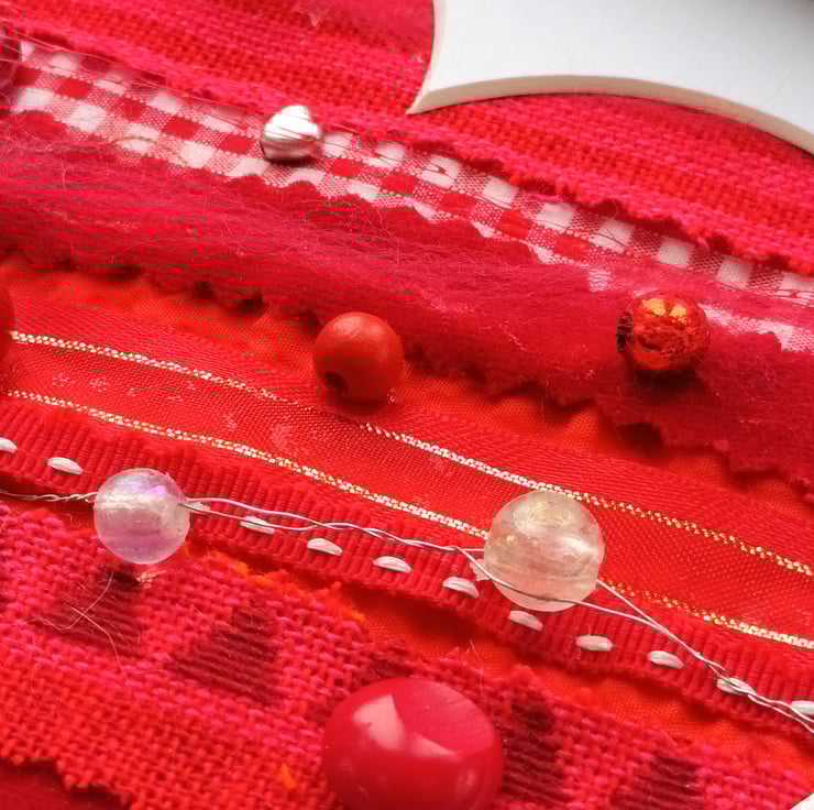 In this pretty textured heart I used chocolate box ribbons and net packaging from a box of supermarket soft fruit alongside remnant fabrics and beads.