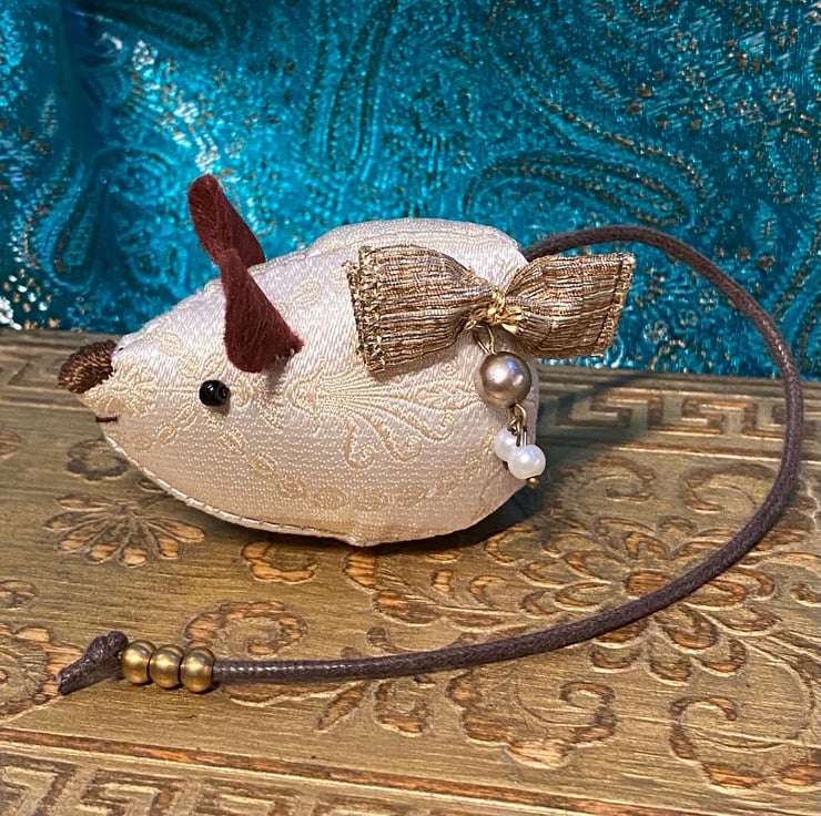 These fairytale mice are hand stitched to a pattern of my own design from scraps of vintage silk brocade. Their bodies are roughly 7-8cm long and stuffed with recycled polyester filling. They have felt ears, glass bead eyes, repurposed cord tails and hand embroidered nose and mouth. Each one is unique and adorned with a bow and repurposed or vintage beads and charms.