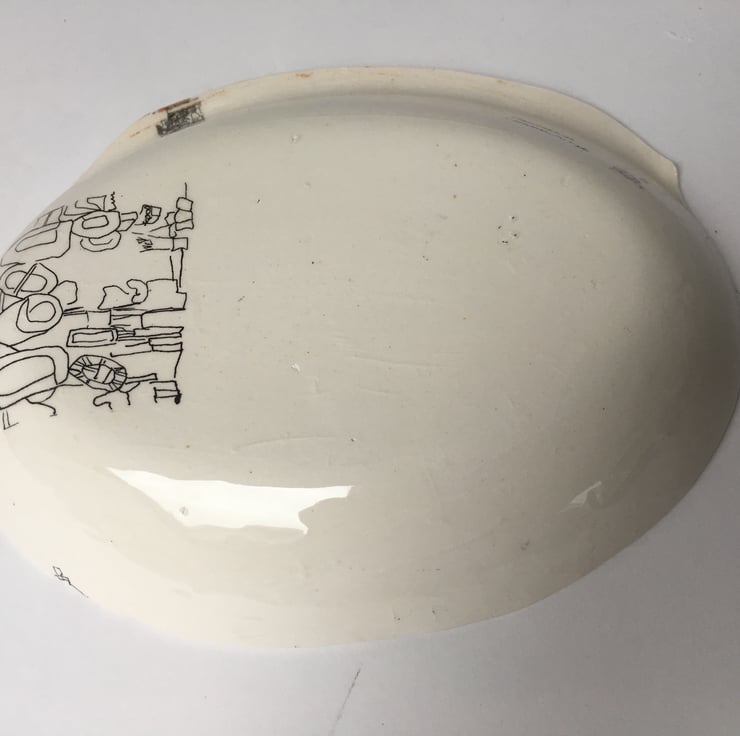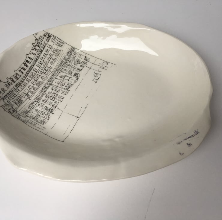 Press moulded white earthenware, transparent glazed, image light boxed with pen and ink as transfers. This decorative plate is one of a kind.