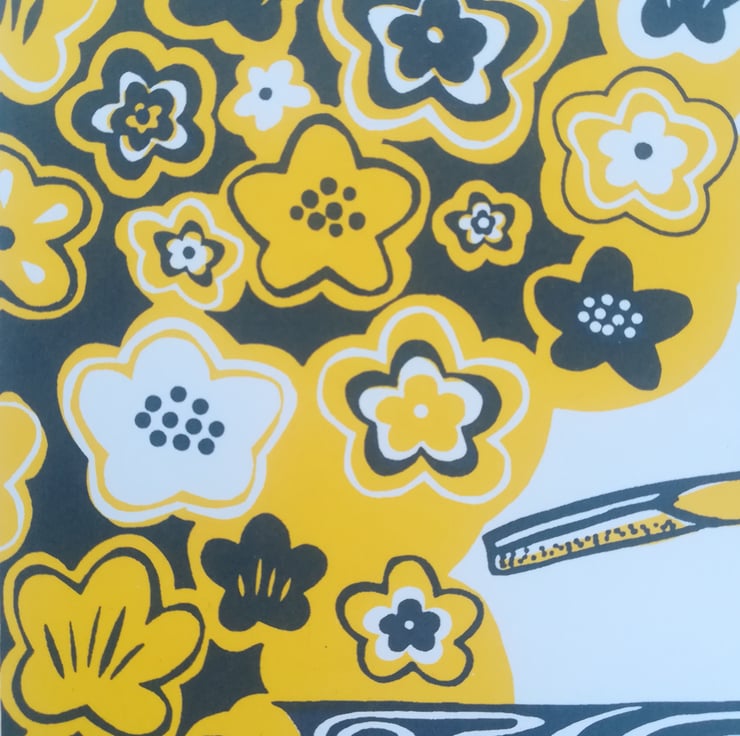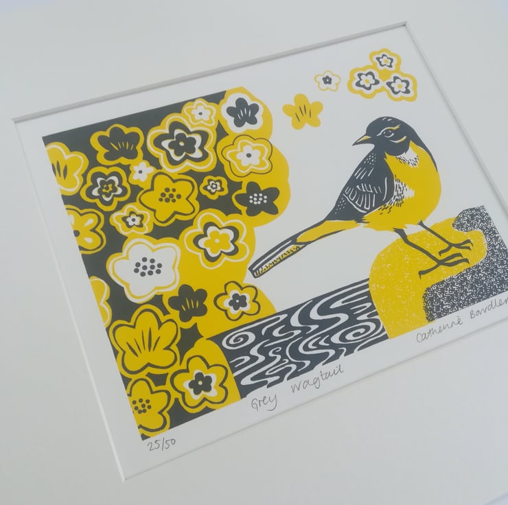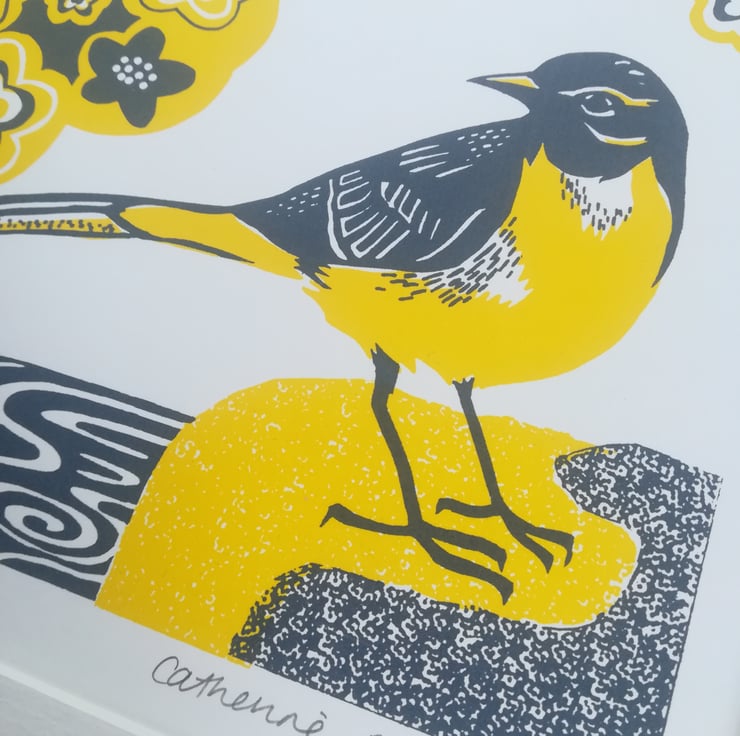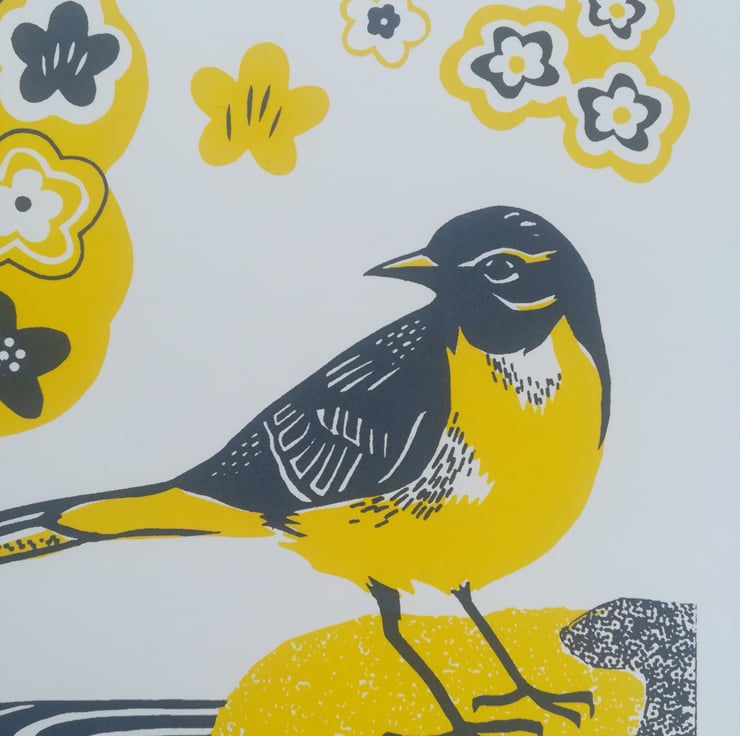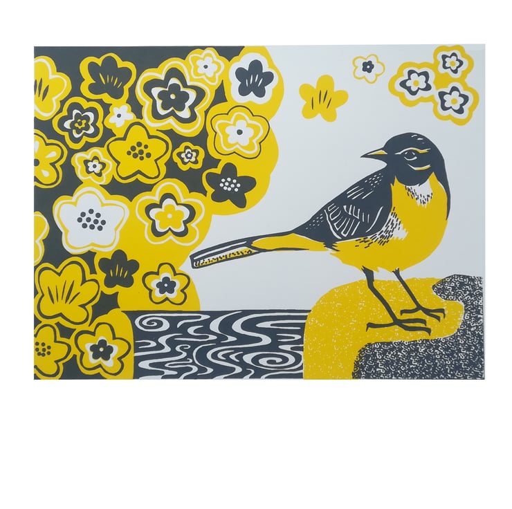 Limited edition original screen print made entirely by hand of a Grey Wagtail by babbling water and pretty primroses in yellow and grey, perfect to bring some Spring/Summer cheer to your home.
